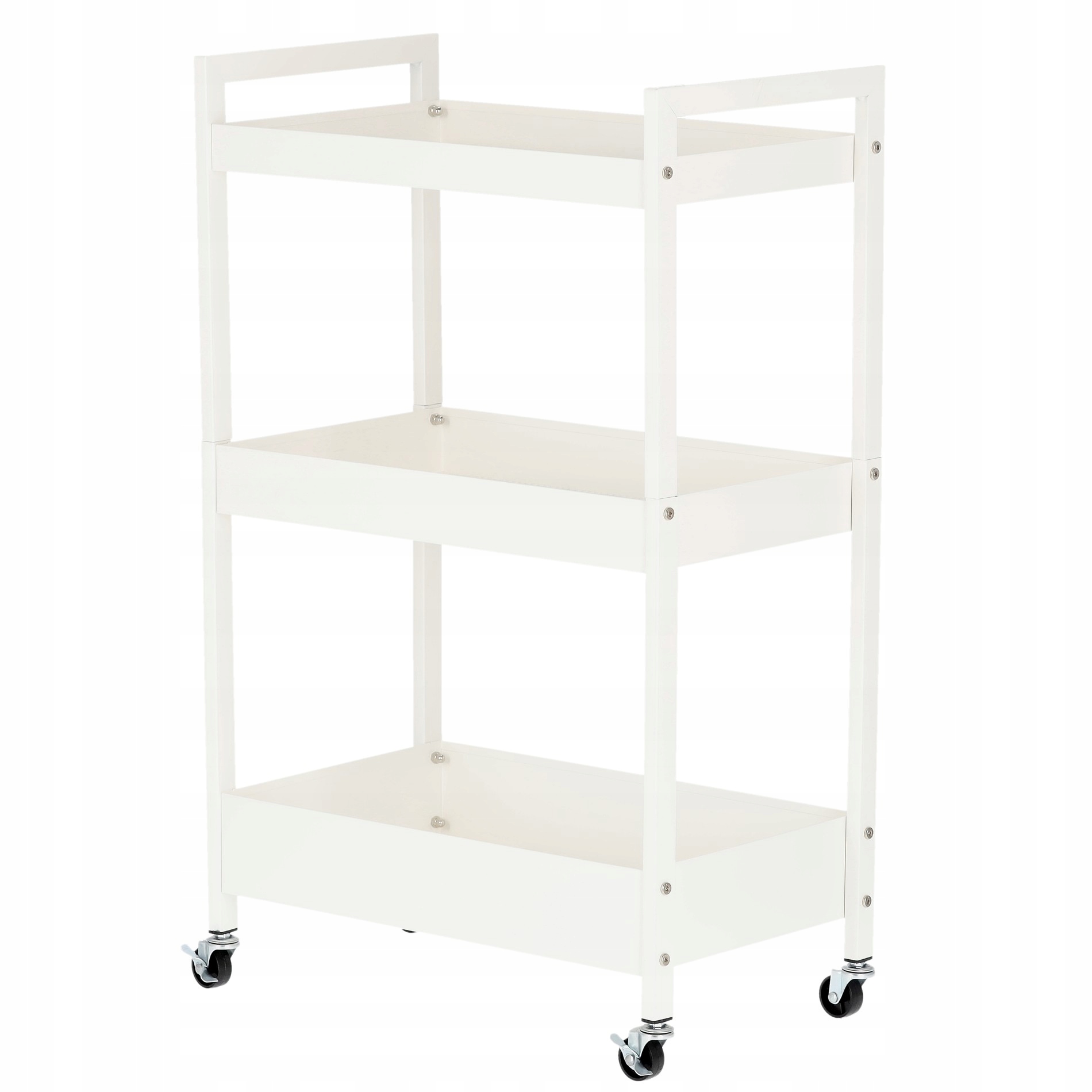 Помощник на колесиках из нержавеющей стали с порошковым покрытием. Он имеет три большие полки. Полка на поворотных (360°) колесах. Два из них имеют замок, благодаря которому коляска устойчиво стоит даже на неровной поверхности. Он имеет прочныеручки для удобной переноски.