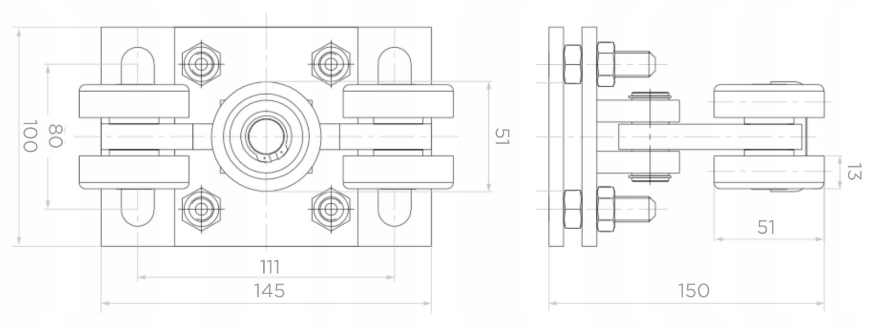 - 2 5-роликовые тележки б >, самовыравнивающийся с регулировкой, размер основания 145х100, стальные ролики