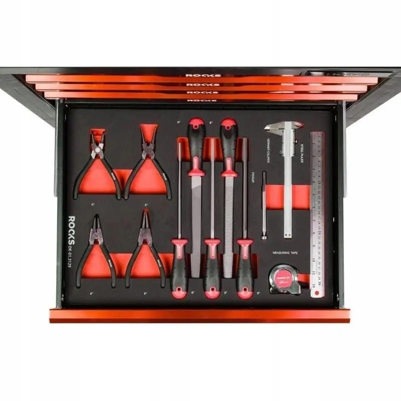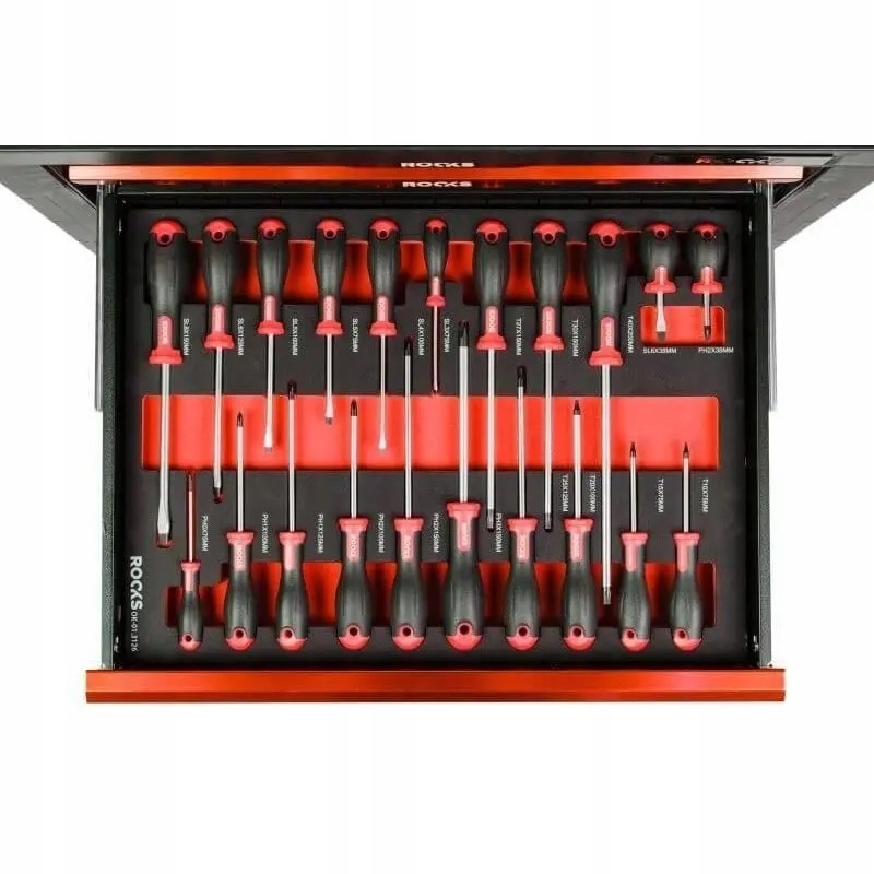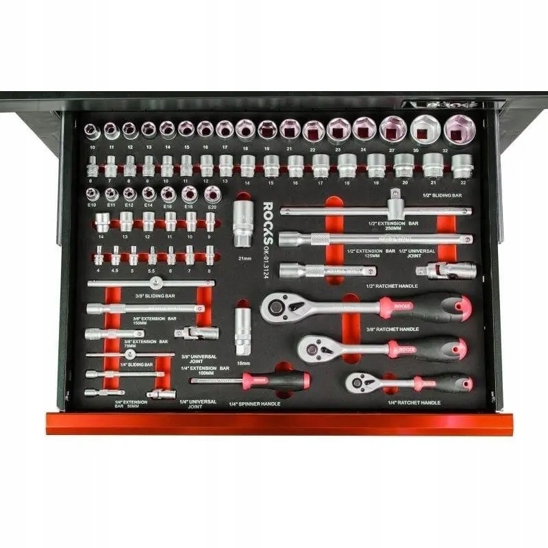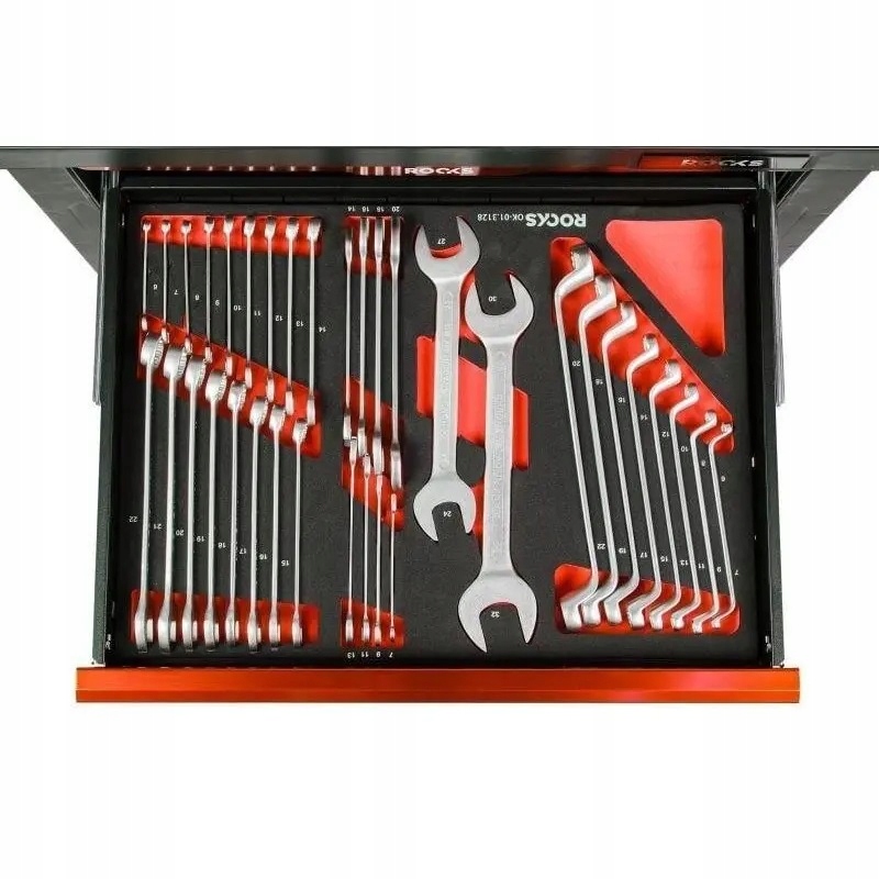 Шкаф имеет качественные инструменты в 5 ящиках в специальных модулях из двухкомпонентной пены. 161 инструмент представляет собой подходящую основу для всех видов механического обслуживания. Дополнительные ящики могут быть оснащены специализированным оборудованием из предложения ROOKS.
