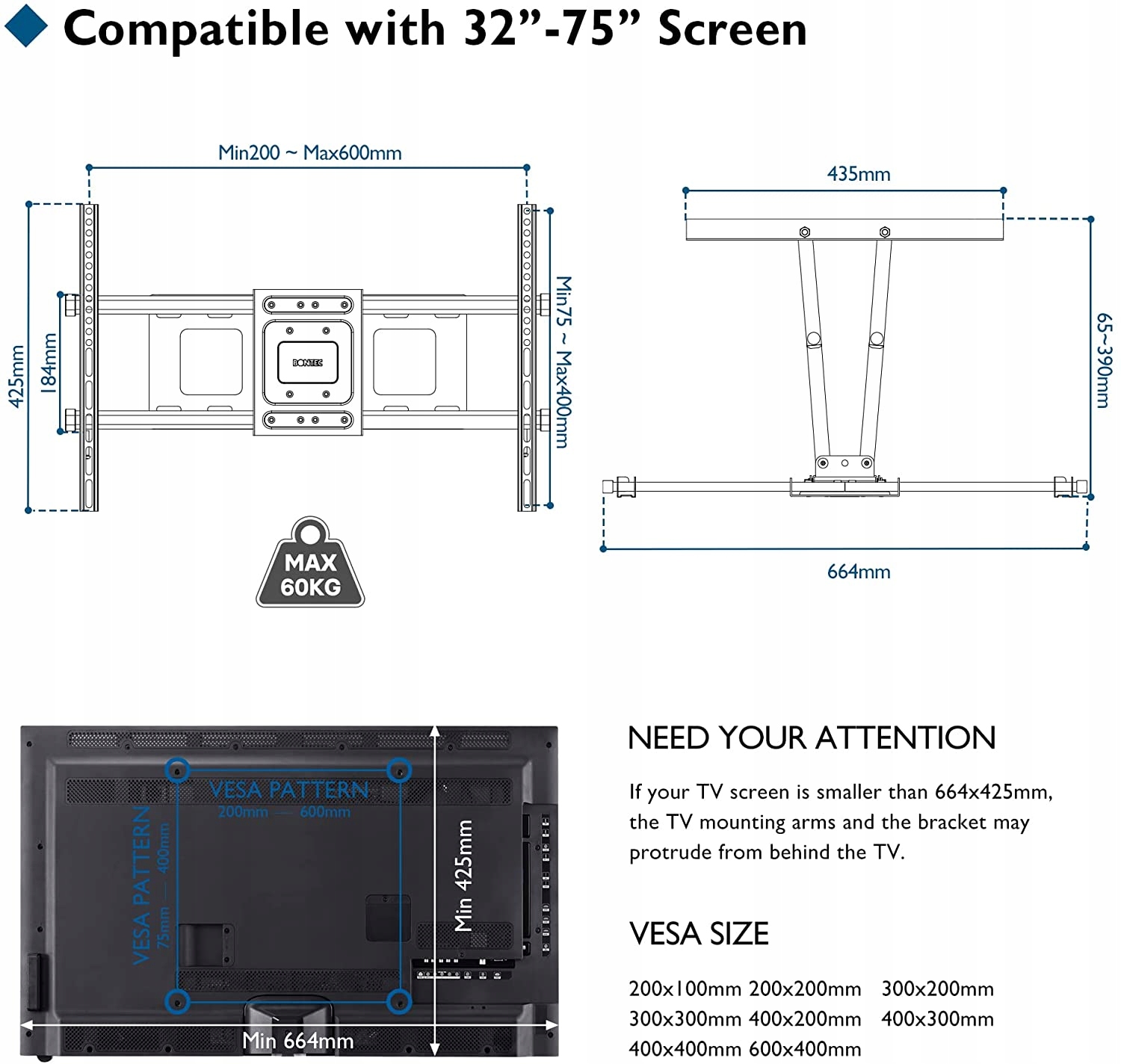 - Наконец -то проверьте свой телевизор. Если размер колеблется от 32 дюймов до 70 дюймов, этот кронштейн будет соответствовать. Да!