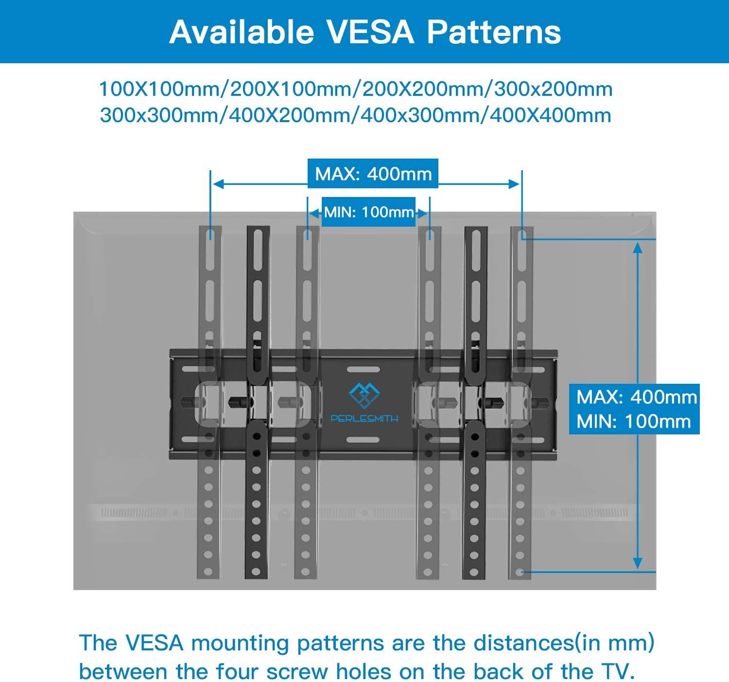 - ✅ Универсальный телевизионный держатель- пости для большинства плоских и изогнутых телевизоров 26 ''- 55 '' весом до 60 кг. Совместимые отверстия для веки: 400x400/400x300/400x200/300x300/300x200/200x200/200x100/100x100 мм. Перед покупкой, пожалуйста, подтвердите отверстие для Веса, положение вершины VESA, вес, спецификация размера телевизора.