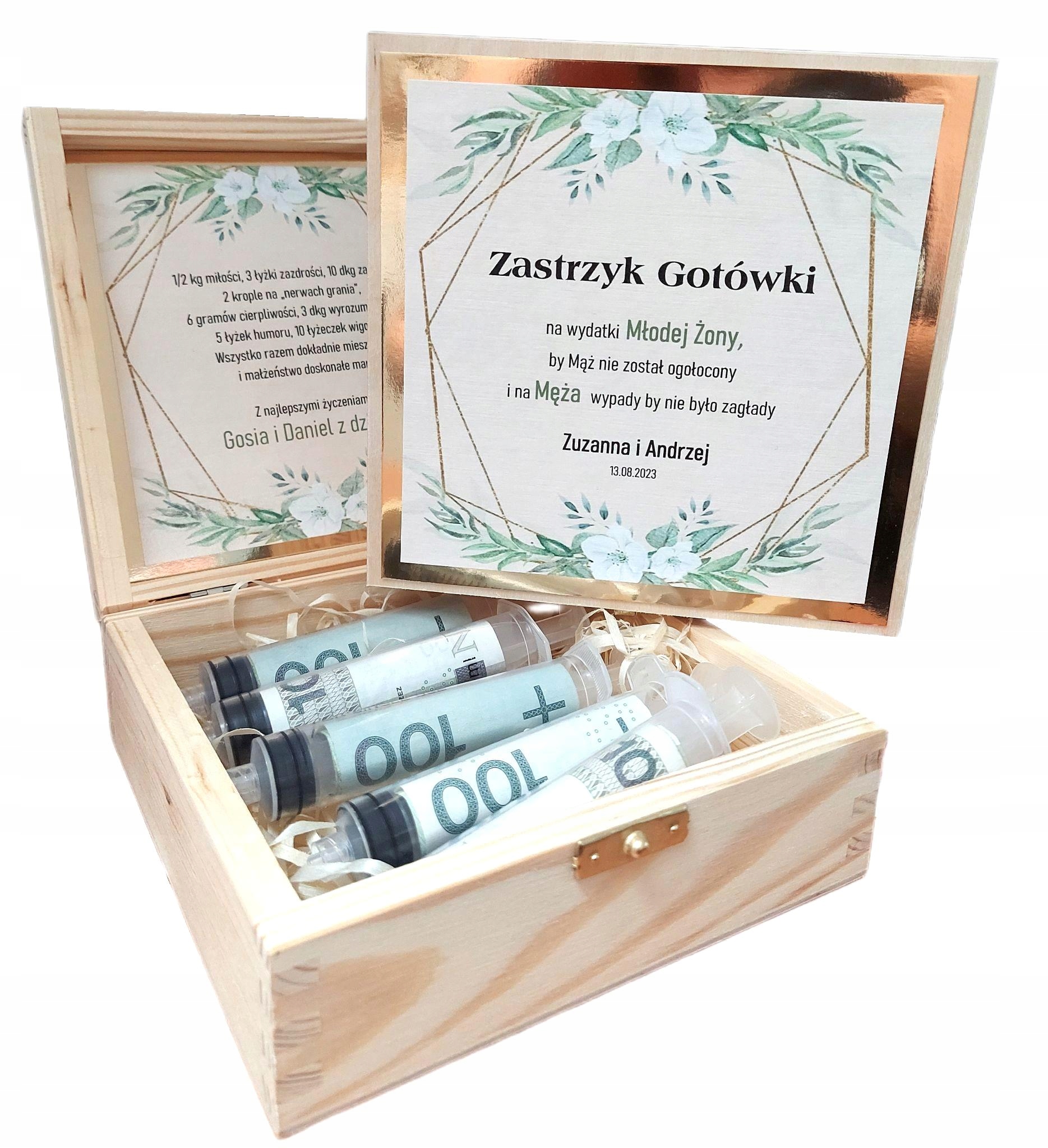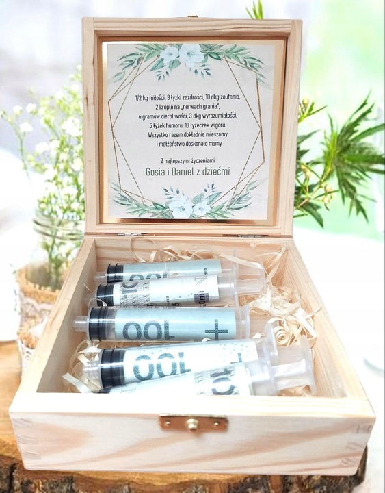 Ящик из светлого соснового дерева с 5 шприцами, в которые мы закатываем и кладем определенную сумму. Пожелания внутри - 40 стихотворений на выбор.