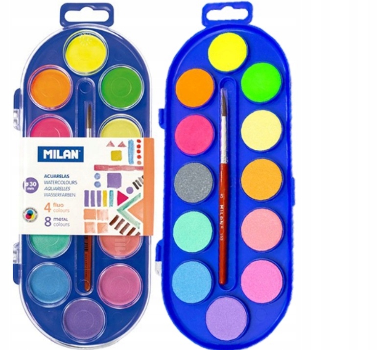 Водяная акварельная краска 12 цветов + кисть МиланаАкварельные краски 12 цветов: 4 цветовых таблеток и 8 металлических цветовых таблеток с диаметром 30 мм. Специально разработано для акварели. Их можно легко вымыть из большинства тканей. Они безопасны для детей.