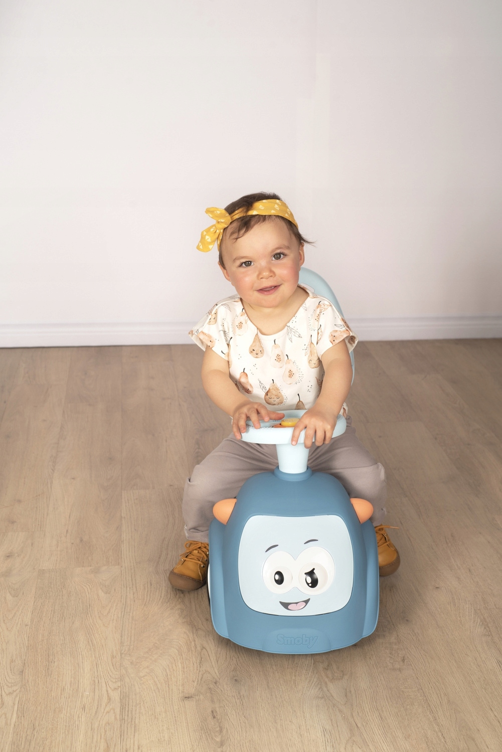 Под сиденьем поездки находится место для хранения, в котором ребенок может собирать различные безделушки. Стабильность обеспечивается широкими колесами. Яркие, радостные цвета, несомненно, привлекут внимание ребенка, поощряя попытку двигаться самостоятельно. Идеальный первый автомобиль для самых молодых детей, которые преподают независимость и привязаны к окружающему миру.