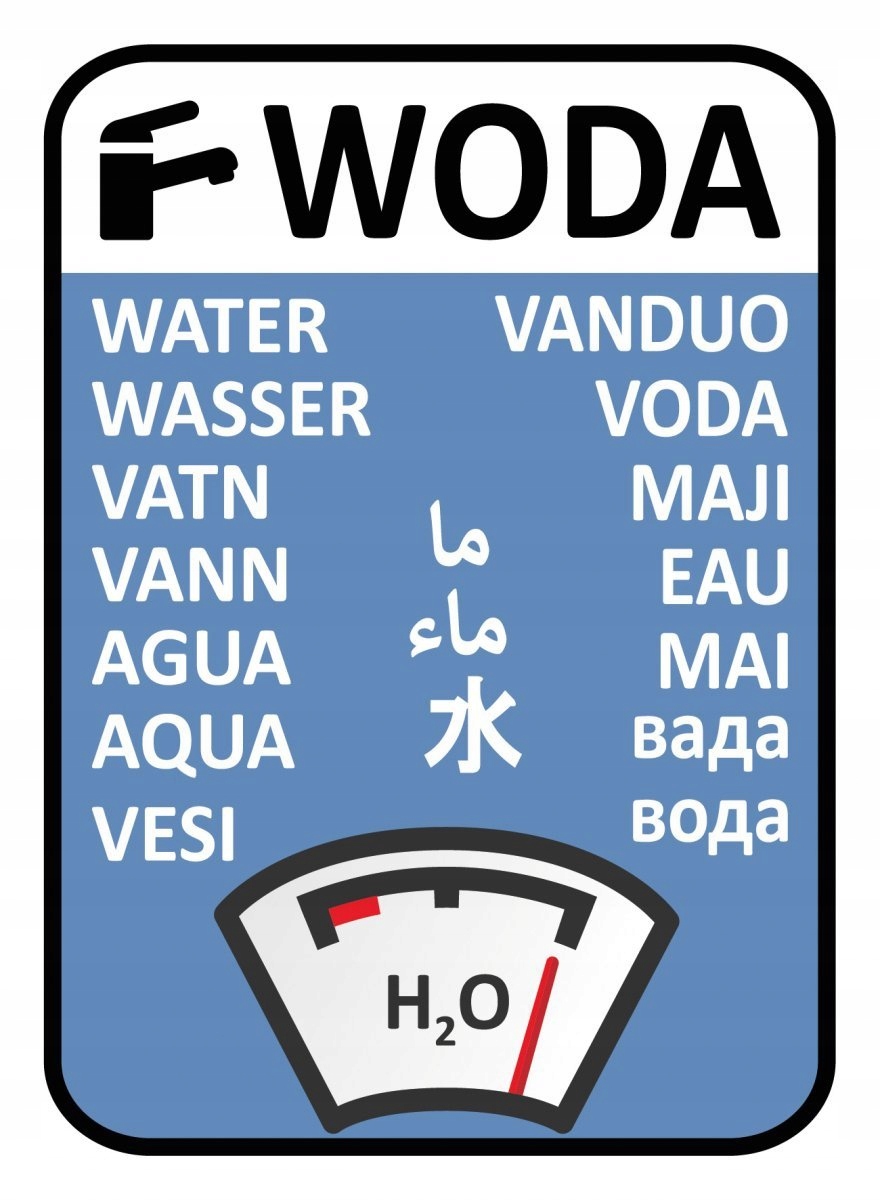 Размещается надпись ВОДА на восемнадцати языках, в том числе: на английском, хорватском, датском, эстонском, финском, французском, исландском, греческом, русском, украинском, иврите, японском, арабском.