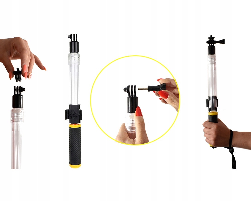 Ручка идеальна для поездок, встреч с друзьями или экстрима и многого другого. Очень прочная и устойчивая конструкция позволяет прикрепить устройство весом до 1000 грамм, а нескользящая ручка обеспечивает надежный и удобный хват в руке. Палка не выскользнет из рук так легко. Палка для селфи имеет дополнительный шнурок с карабином, который предохраняет палку от внезапного выскальзывания спортивной камеры с палкой на поверхность воды или падения. Стик изготовлен из прочного и стойкого бесцветного материала ABS.