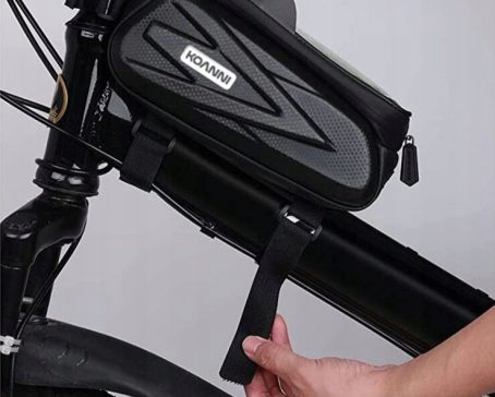 Велосипедная сумка, оснащенная одной большой камерой и дополнительной крышей защиты от солнечных лучей.