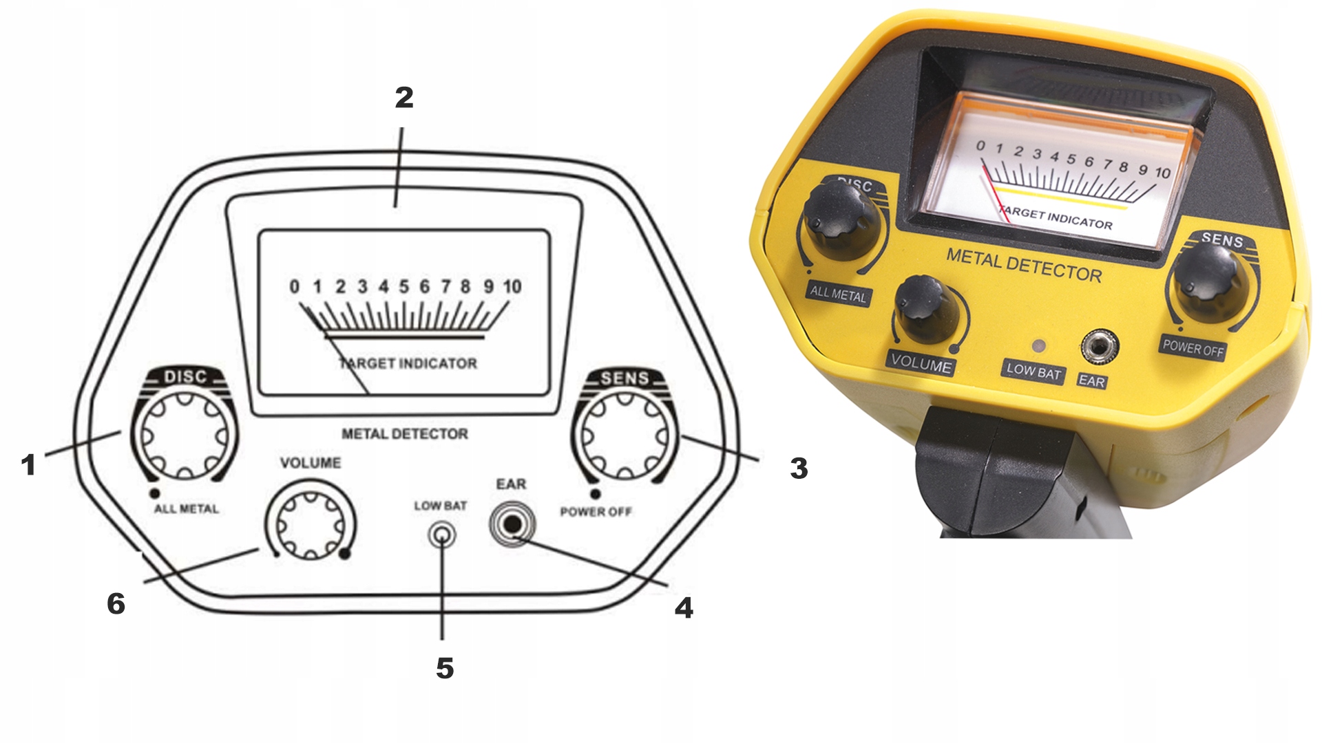 - Визуальная индикация — при обнаружении металла указатель счетчика переместится вправо< /li>