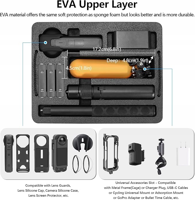Двухслойный жесткий футляр Amazear X4 — это профессиональный прочный футляр, предназначенный для камер Insta360 X4 и совместимый с моделями X3, ONE X2. Благодаря продуманной двухуровневой конструкции он позволяет безопасно и удобно хранить как камеру, так и все необходимые аксессуары.