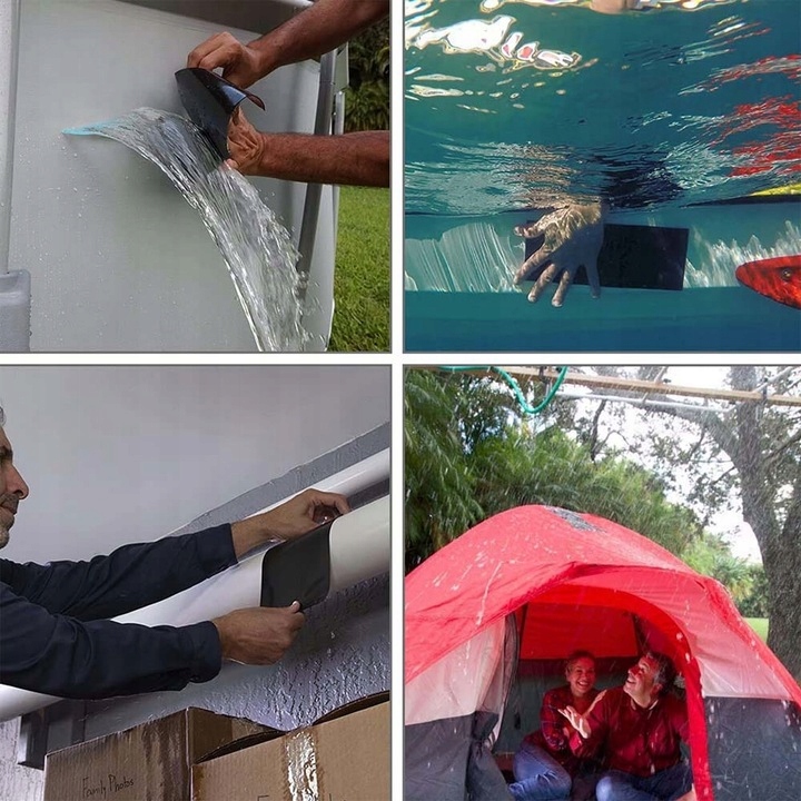 Ленту можно использовать приклеивается к большинству материалов, идеально подходит для заделки дыр в пластике, дереве, камне, металле, штукатурке, штукатурке, кирпиче или бетоне. Благодаря этому его можно использовать не только для заделки дыр в бассейне, но и для герметизации протекающих, треснутых труб, порванных брезентов, матрасов или понтонов и многого другого. Ленту можно крепить «сухим», «мокрым», а также под водой. Кроме того, он устойчив к УФ-излучению. С помощью этого продукта можно отремонтировать и загерметизировать практически все!