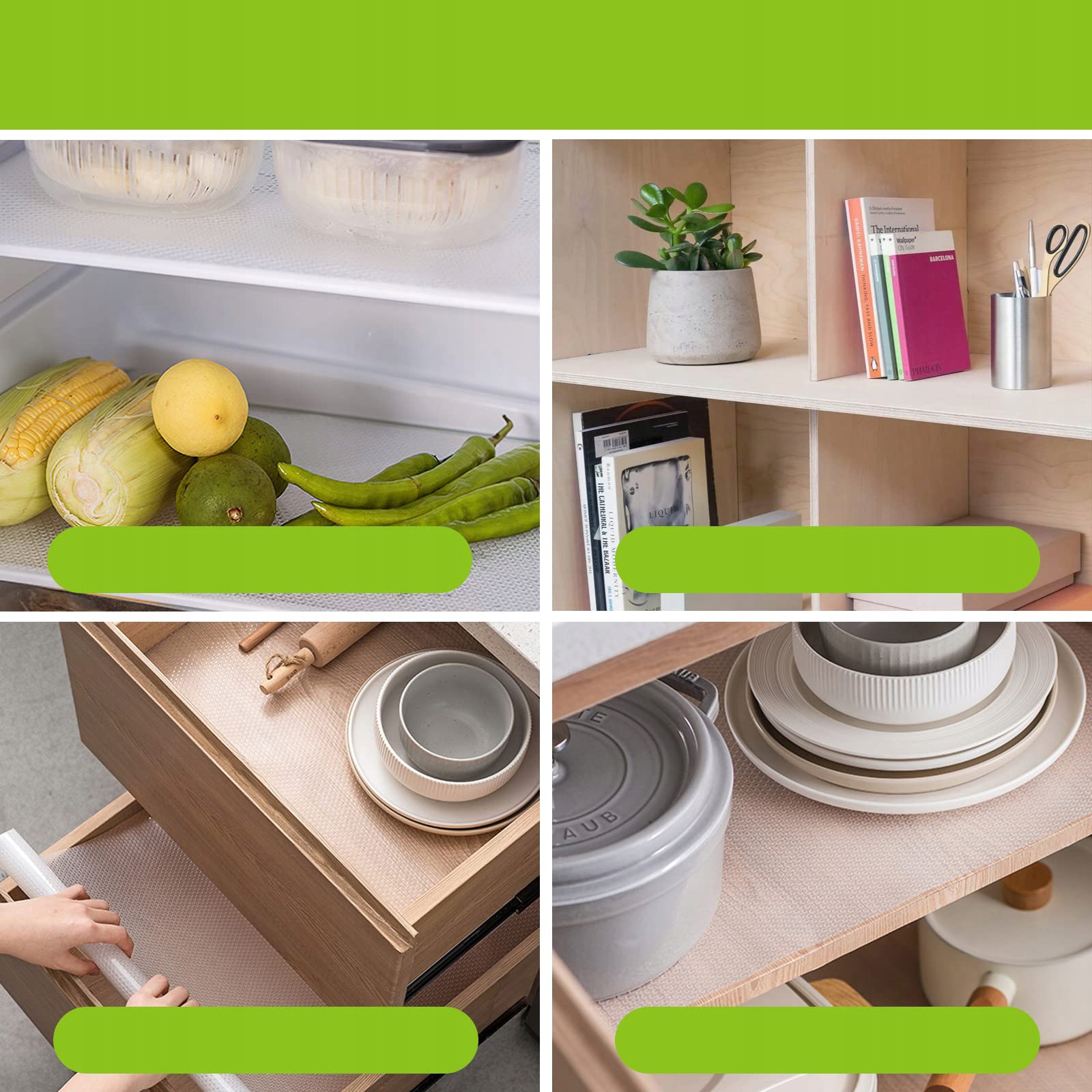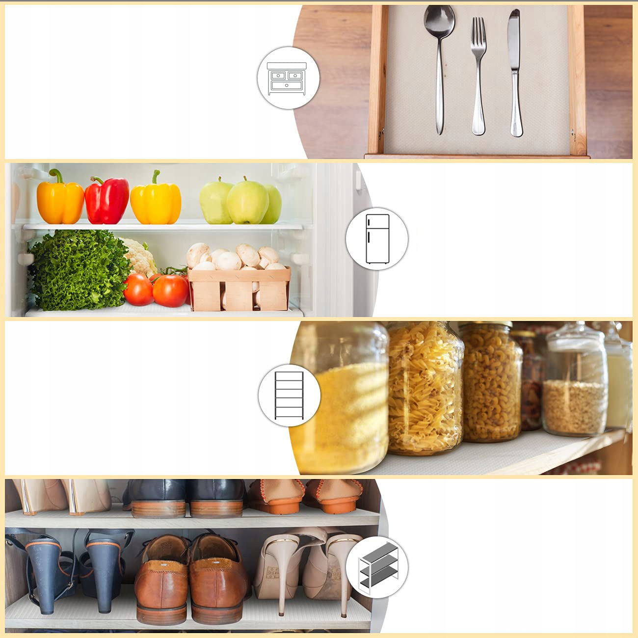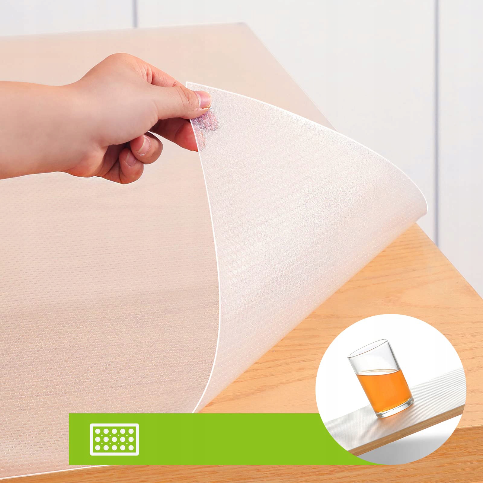 Ящики с противоскользящим ковриком, приподнятая верхняя часть предотвращает соскальзывание деликатных предметов с ящиков, шкафов, полок, столов, холодильников. Специальный процесс без текстуры на нижней части может улучшить сцепление со столешницей. Конструкция без клея предотвращает повреждение столешницы, а противоскользящая конструкция обеспечивает идеальную безопасность тарелок, мисок, столовых приборов и шкафов.