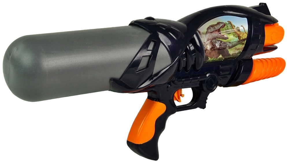 Представленный водяной пистолет выполнен в черно-сером цвете. На пистолете также присутствуют изображения динозавров на фоне окружающей их среды. Боеприпасы, то есть вода, безопасны, и вы можете затеять драку с семьей или сверстниками.