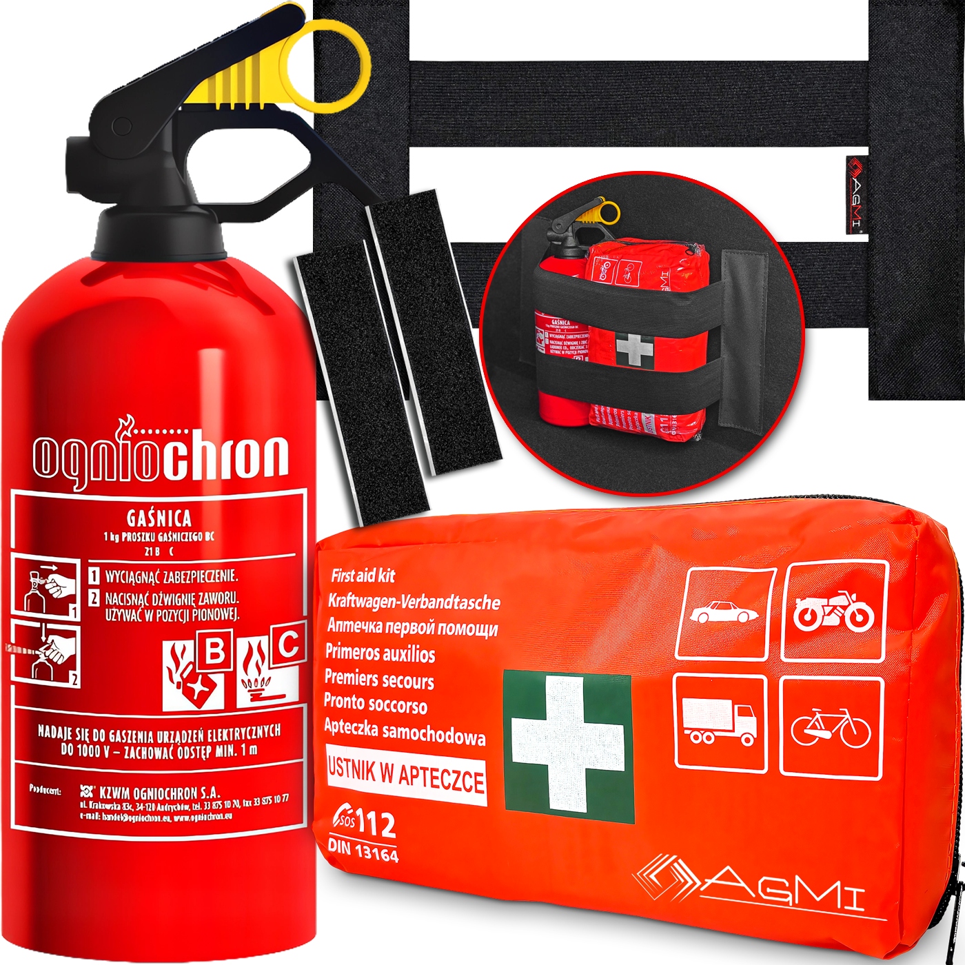 🚗 КОМПЛЕКТ - ОГНЕТУШИТЕЛЬ 1 КГ ОГНЕЗАЩИТА + ПОЖАРНЫЙ КОМПЛЕКТ DIN13164 + КРЕПЛЕНИЕ РУЧКИ БАГАЖНИКА НА ВЕЛКРО + ПОЛОСКИ С КЛЕЕМ ДЛЯ КРЕПЛЕНИЯ РУЧКИ