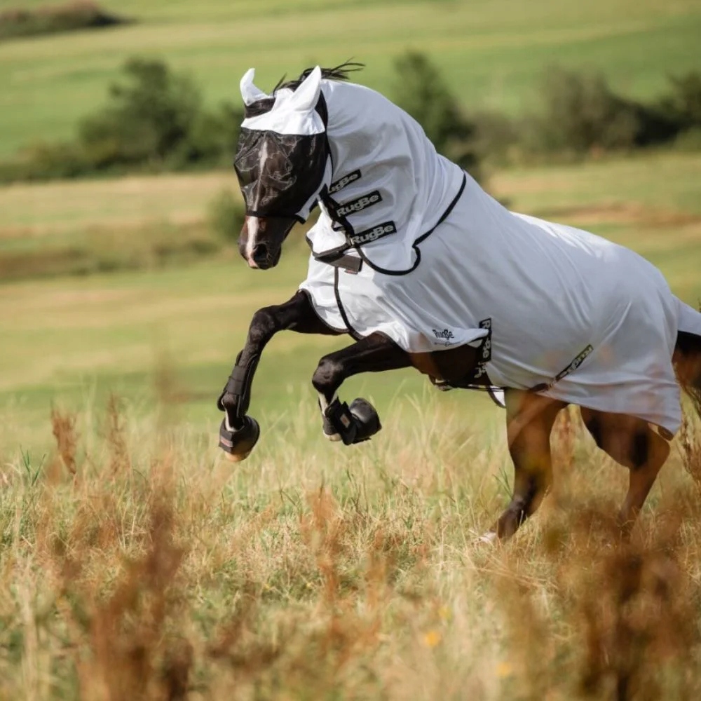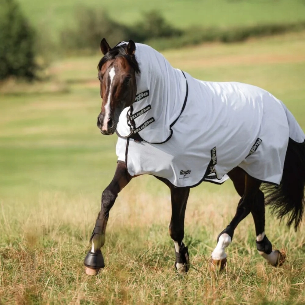 Пастбище. Блестящий, дышащий материал защищает от перегрева, а густая тканая, мягкая полиэфирная сетка эффективно защищает от мух, комаров и других навязчивых насекомых.