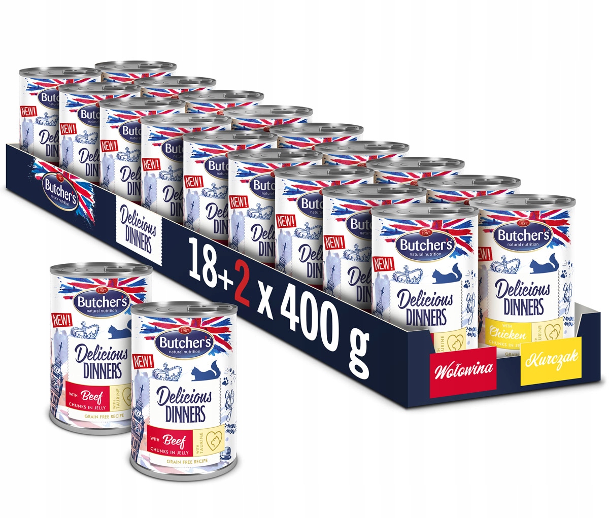 Набор влажного корма для кошек «Вкусный ужин», говядина, курица, 18 шт. по 400 г + БЕСПЛАТНО