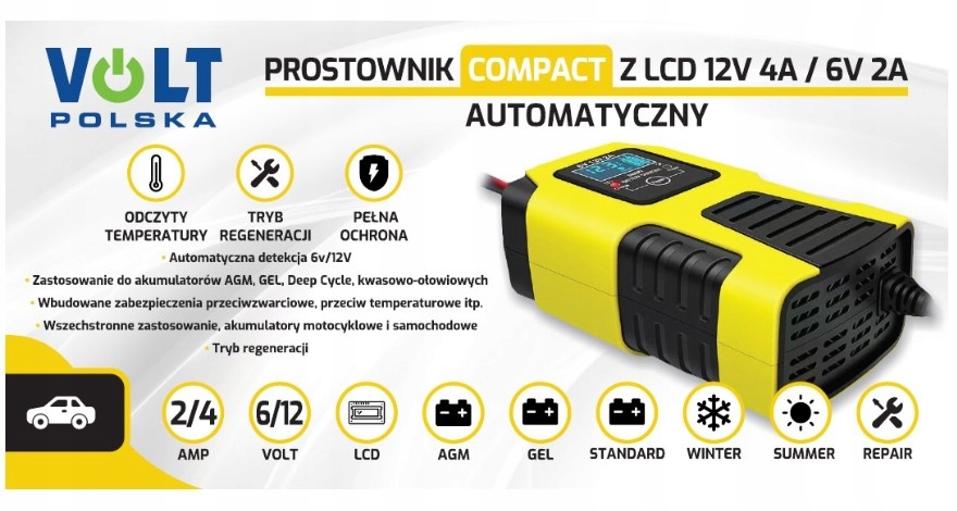 Автоматический выпрямитель LCD 12V 4A/6V 2A Compact -это автоматический выпрямитель с 7-градусной зарядкой традиционных аккумуляторов, Acid-Alaicon, гель (гель), AGM, VRLA с вместимостью от 4AH до 40AH.