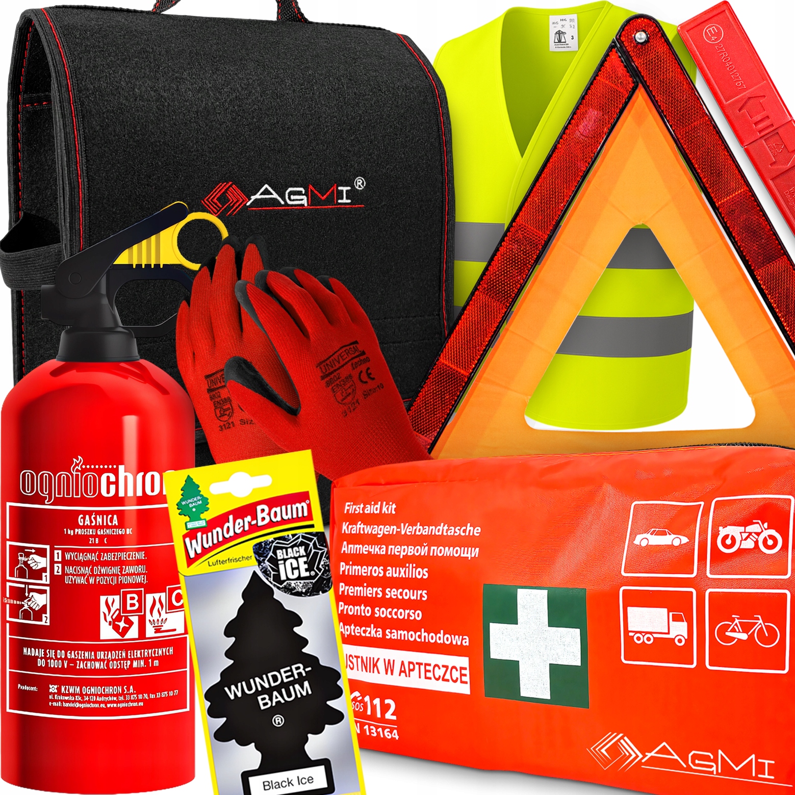 ОГНЕТУШИТЕЛЬ 1 КГ ПЕРВЫЙ КОМПЛЕКТ DIN13164 ЖИЛЕТ СУМКА НАБОР ТРЕУГОЛЬНЫХ ПЕРЧАТОК