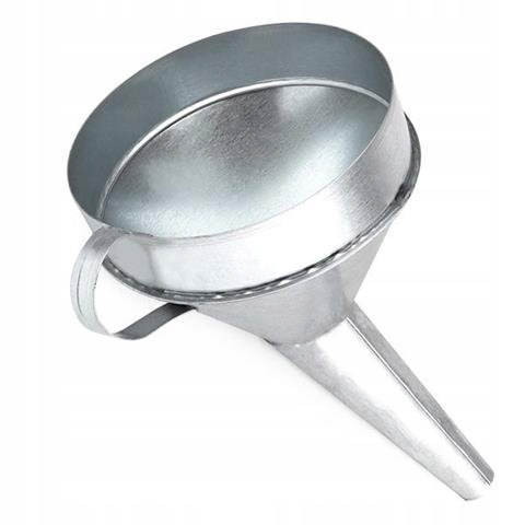 Воронка металлическая, луженая, излив изогнутый, покатый, удобная ручка, сетчатый фильтр, защищающий от загрязнений.