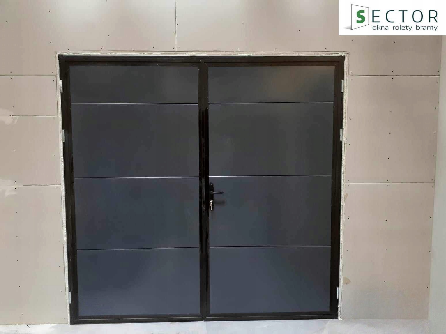 По периметру имеется резиновый уплотнитель, а в нижней части - уплотнительная щетка. Ворота имеют симметричное разделение створок и всегда открываются наружу помещения. Активное дверное полотно оснащено замком со вставкой и ручкой, а также ригелем в нижней и верхней части дверного полотна.