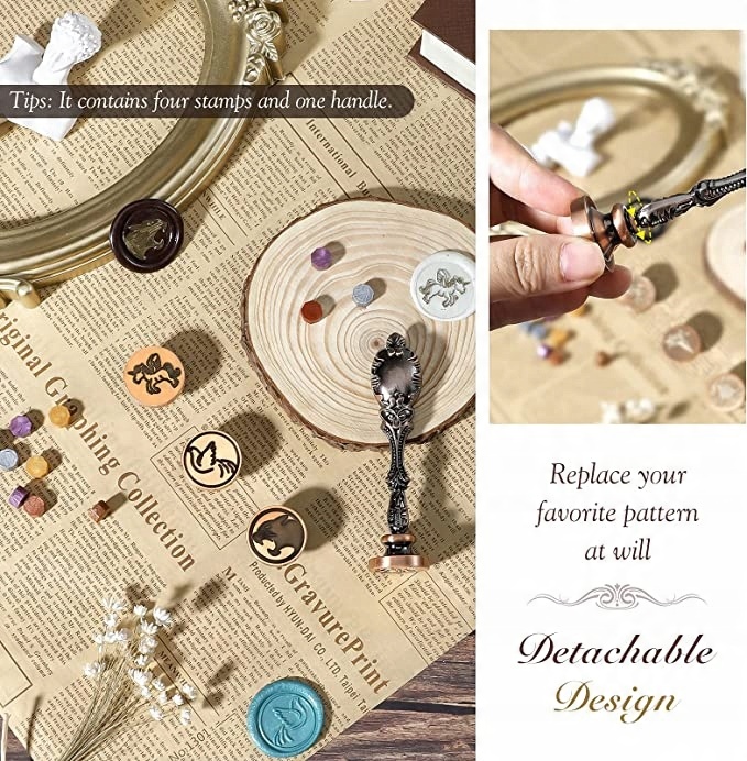 - Стиль ретро: Наш набор восковых марков содержит 1 прочную металлическую ручку и 4 головки штампов. Резной ручкой с отличным выступлением является винтажный, ретро и классический. Детали на головах марок очень ясны и имеют те же цвета, что и ручка, которая является гармоничным и красивым. Различные дизайны животных: голубь, гепарда, лошадь и сова, добавление элемента, который различает ваши конверты или карты. и легко заменить. Идеально подходит для свадьбы, дня рождения, Дня святого Валентина, Рождества, Дня благодарения и других случаев. Диаметр марки составляет 2,5 см/0,98 дюйма
