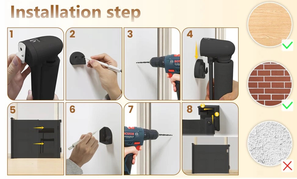 Поставляется с двумя монтажными наборами, он легко устанавливается в различных пространствах, даже на дверь с помощью плинтусов, без необходимости скручивать винты