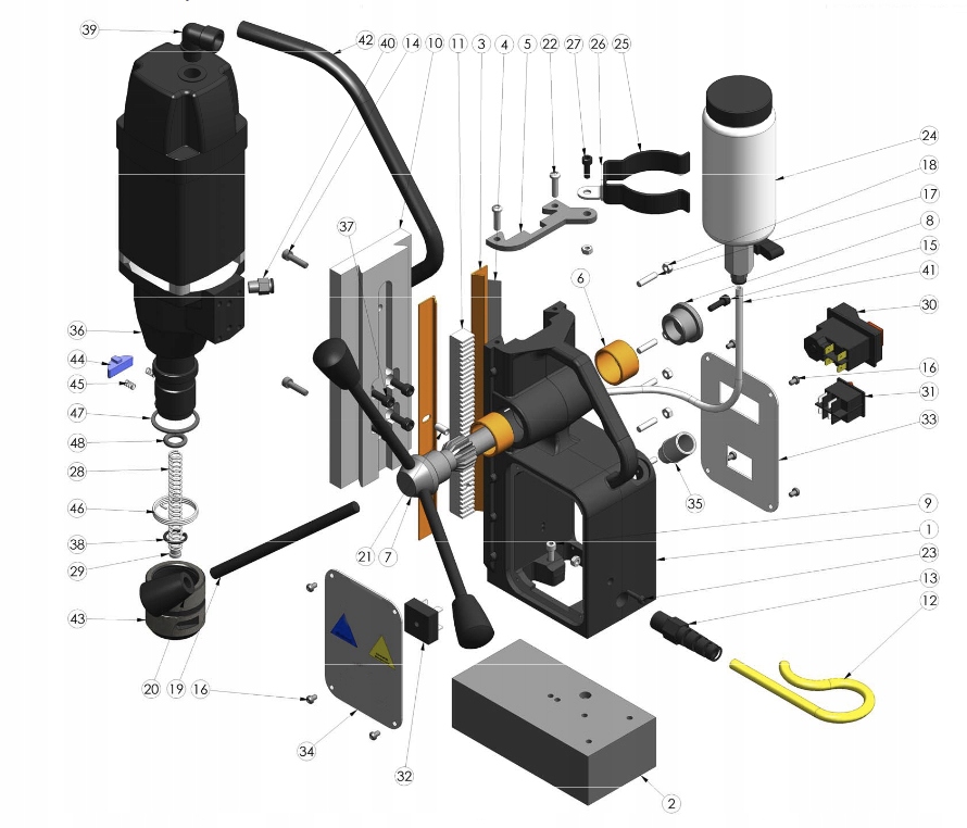 Магнитная дрель MB 35 с магнитным основанием имеет мощный двигатель. - 1050 Вт – что делает работу эффективной и стабильной. Внимание к деталям, качество отделки и эргономичный дизайн при относительно небольшом весе – 11,6 кг – позволяют выполнять точную работу. В случае с трепанирующими сверлами можно сверлить отверстия диаметром до 35 мм. Кроме того, благодаря встроенной системе охлаждения охлаждающая жидкость подается непосредственно из бака к сверлильному шпинделю.