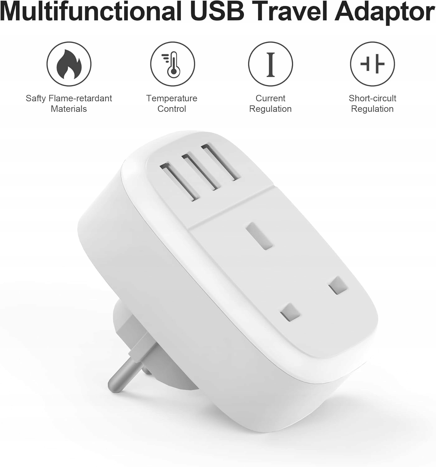 Портативный и надежный: вилка для путешествий из Великобритании в Европу со встроенными многофункциональными функциями защиты, включая контроль перегрева, контроль короткого замыкания, регулирование перегрузки по току и регулирование перенапряжения. Это обеспечивает безопасность вас и вашего оборудования во время использования.