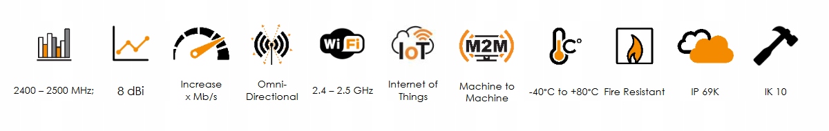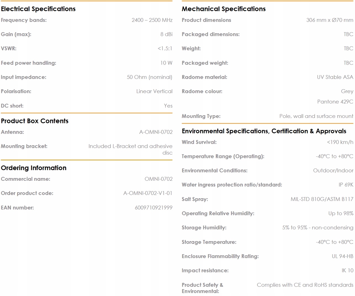 Антенна OMNI-702 — это всенаправленная антенна Wi-Fi, разработанная компанией Poynting. Антенна работает в диапазоне 2,4 – 2,5 ГГц, перекрывает диапазон Wi-Fi 2,4 ГГц и имеет максимальный коэффициент усиления 8 дБи. Постоянное усиление по всему диапазону обеспечивает улучшенную производительность при надежном соединении. Антенна разработана для превосходного контроля диаграммы направленности во всем диапазоне частот, что делает OMNI-702 исключительной всенаправленной антенной для своего размера. Антенна может подключаться к любой точке доступа Wi-Fi, решать проблему слабого сигнала и обеспечивать высочайшую производительность и гибкость Wi-Fi. Прочная конструкция корпуса обеспечивает защиту в неблагоприятных условиях окружающей среды со степенью защиты IP69K и IK10. Антенна имеет гнездовой разъем N-типа в основании, к которому можно подключить кабель нужного типа и длины.