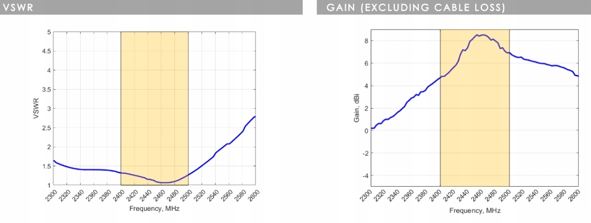 8 дБи — это пиковое усиление во всех диапазонах от 2400 до 2500 МГц