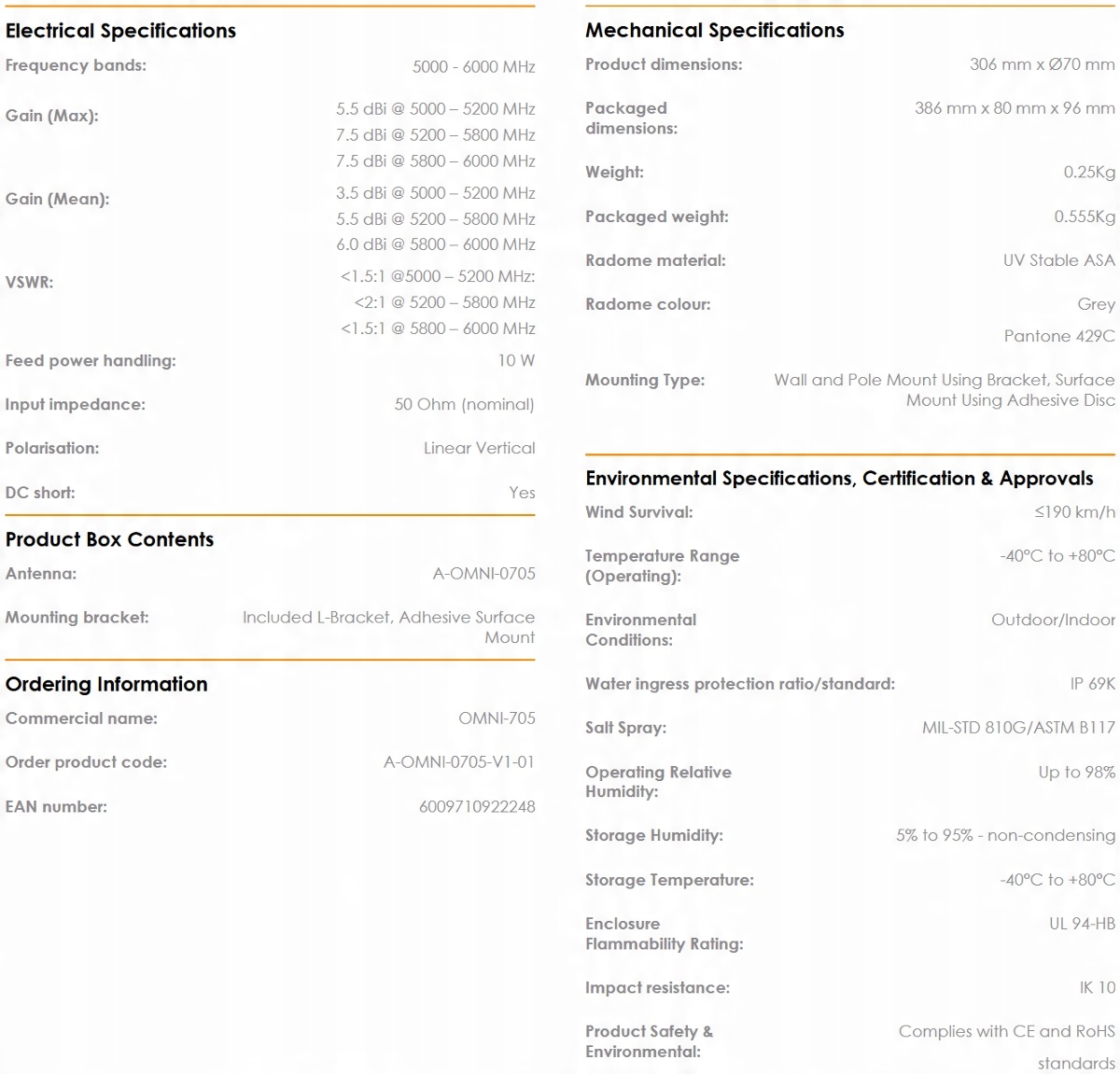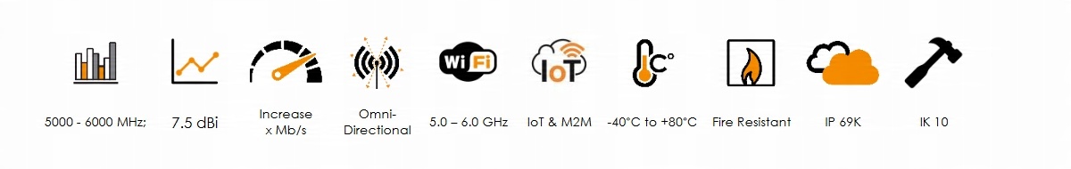 Антенна OMNI-705 — это всенаправленная антенна Wi-Fi, разработанная компанией Poynting. Антенна работает в диапазоне 5,0 – 6,0 ГГц, перекрывает диапазон Wi-Fi 5 ГГц и имеет максимальное усиление 7,5 дБи. Постоянное усиление по всему диапазону обеспечивает улучшенную производительность при надежном соединении. Антенна разработана для превосходного контроля диаграммы направленности во всем диапазоне частот, что делает OMNI-705 исключительной всенаправленной антенной для своего размера. Антенну можно подключить к любой точке доступа Wi-Fi и обеспечить высочайшую производительность и гибкость Wi-Fi. Прочная конструкция корпуса обеспечивает защиту в неблагоприятных условиях окружающей среды по стандартам IP 69К и IK 10. Антенна имеет в основании гнездовой разъем типа N, к которому можно подключить кабель нужного типа и длины.