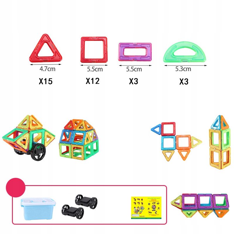 Эта игрушка для детей содержит 12 квадратных блоков, 15 треугольных блоков, 3 полугольные блоки, 3 прямоугольные блоки, 4 колеса, 2 колеса, 26 карт с буквами (не магнитными), 54 карты, 1 ящик для хранения, 1 руководство пользователя. Дети могут различать геометрические формы с блоками и видеть разные формы блоков. (Совет: Цвета блоков случайны, но формы постоянны!)