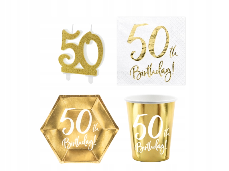 1. Салфетки 50 -й день рождения белые 20 шт. Бумажные чашки 50 -й день рождения золото 220 мл 6pcs