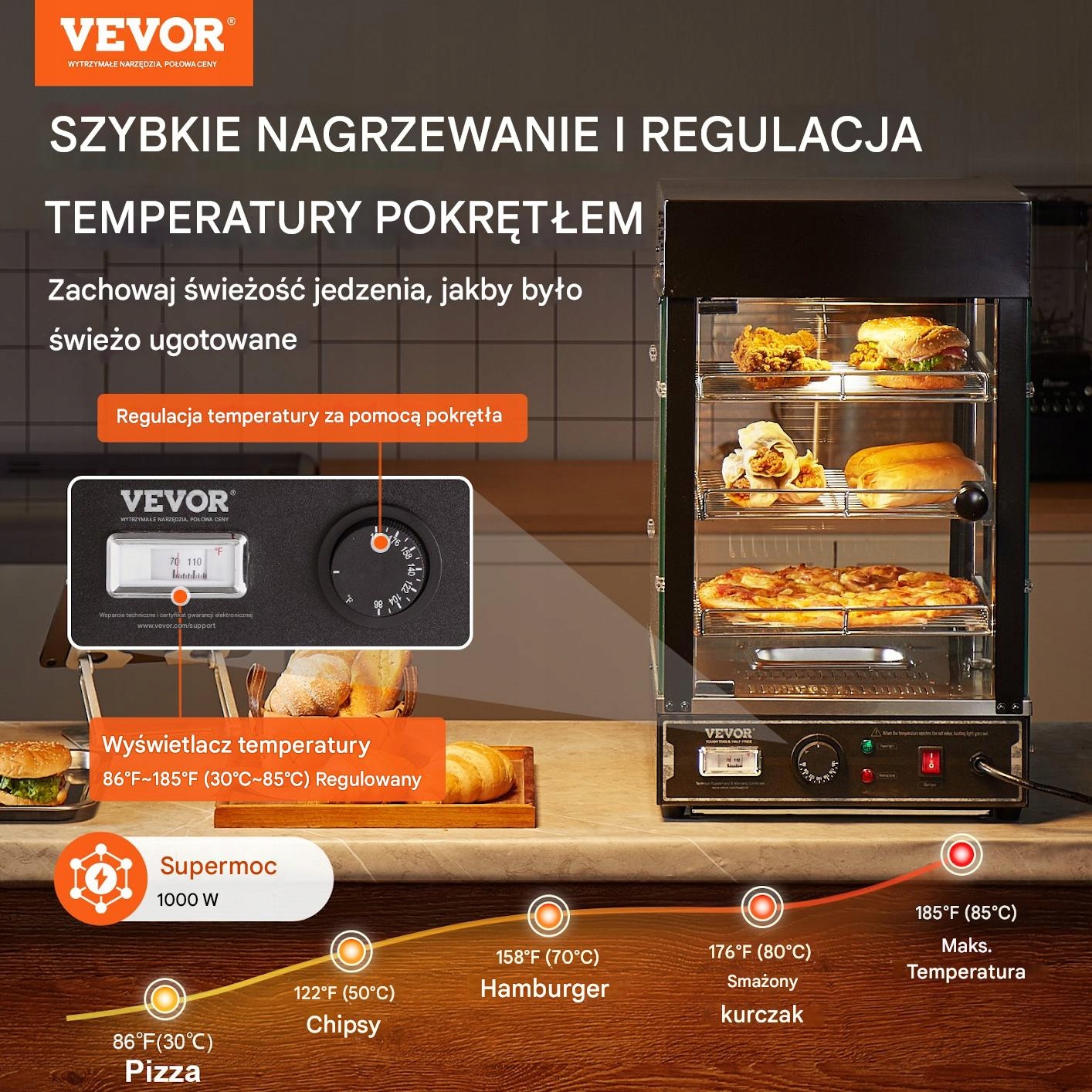Вы хотите, чтобы ваши блюда всегда были теплыми, свежими и аппетитными? Этот сайт отопления является решением для кафе, пекарни, ресторана быстрого питания или магазинов, работающих в магазинах . Идеально подходит для отопления пиццы, жареной курицы, яичного пирога или гамбургеров . Больше нет сухой посуды - поднос для воды заботится о влажности, и вы получаете довольных клиентов!