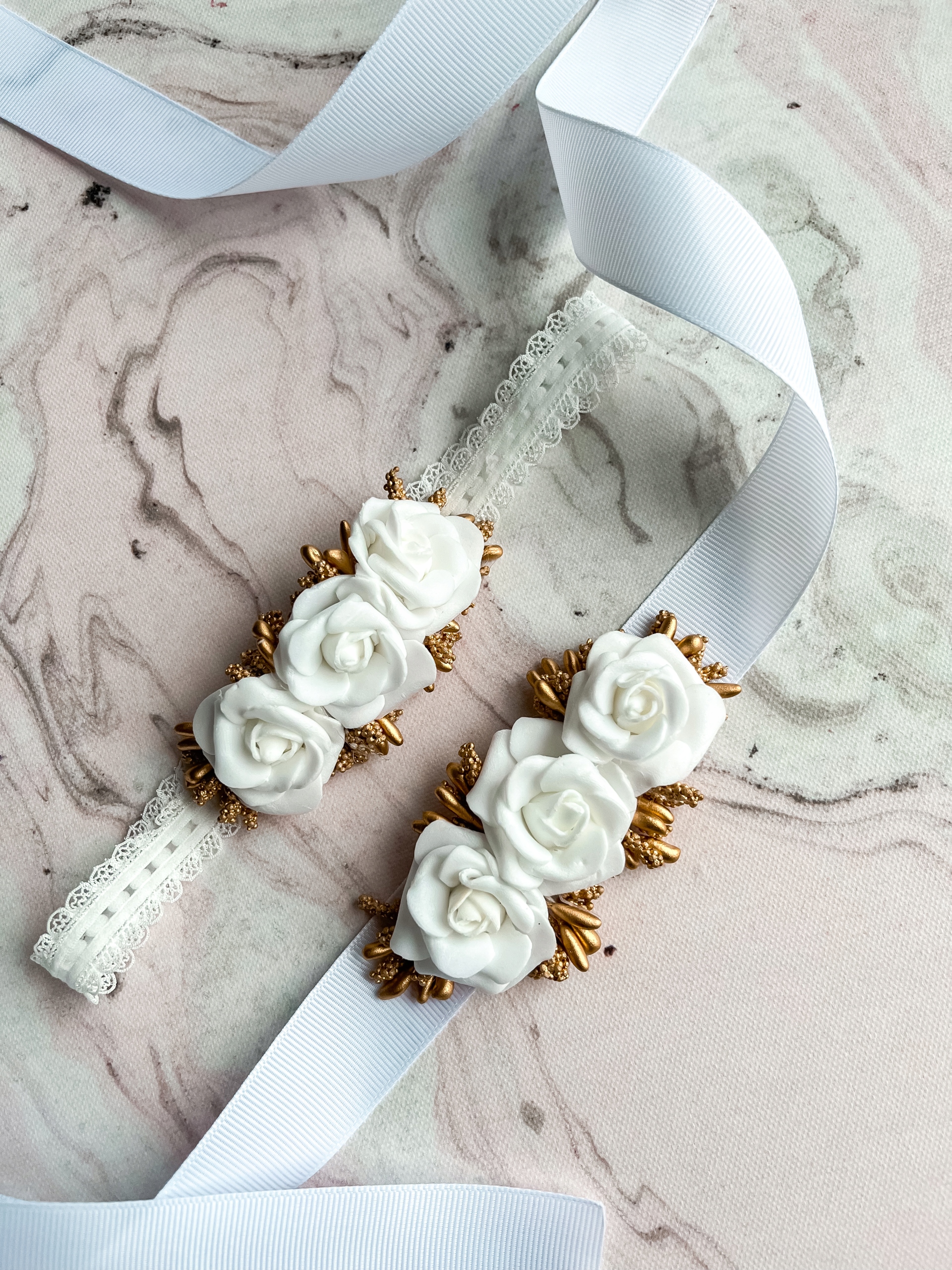 Набор, состоящий из золотой полосы и ремня. Кружево очень деликатное, гибкое и выглядит элегантно. Композиция на цветах с размером 3 см.