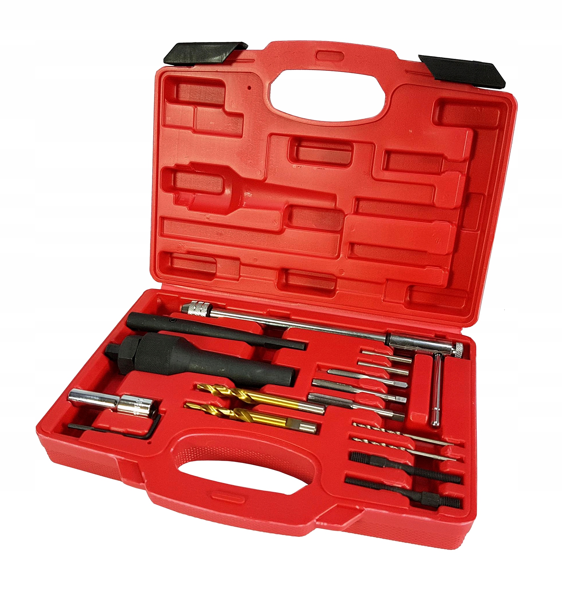 Установлен для вытягивания и демонтажа разбитых заглушек свечения и регенерации резьбы в голове во время замены свечей. Включает инструменты для наиболее распространенных потоков M8X1 и M10X1. Набор используется для перематывания гнезда в головке цилиндра после перелома свечи или разрыва потока - для светящихся потоков M8x1 и M10x1.