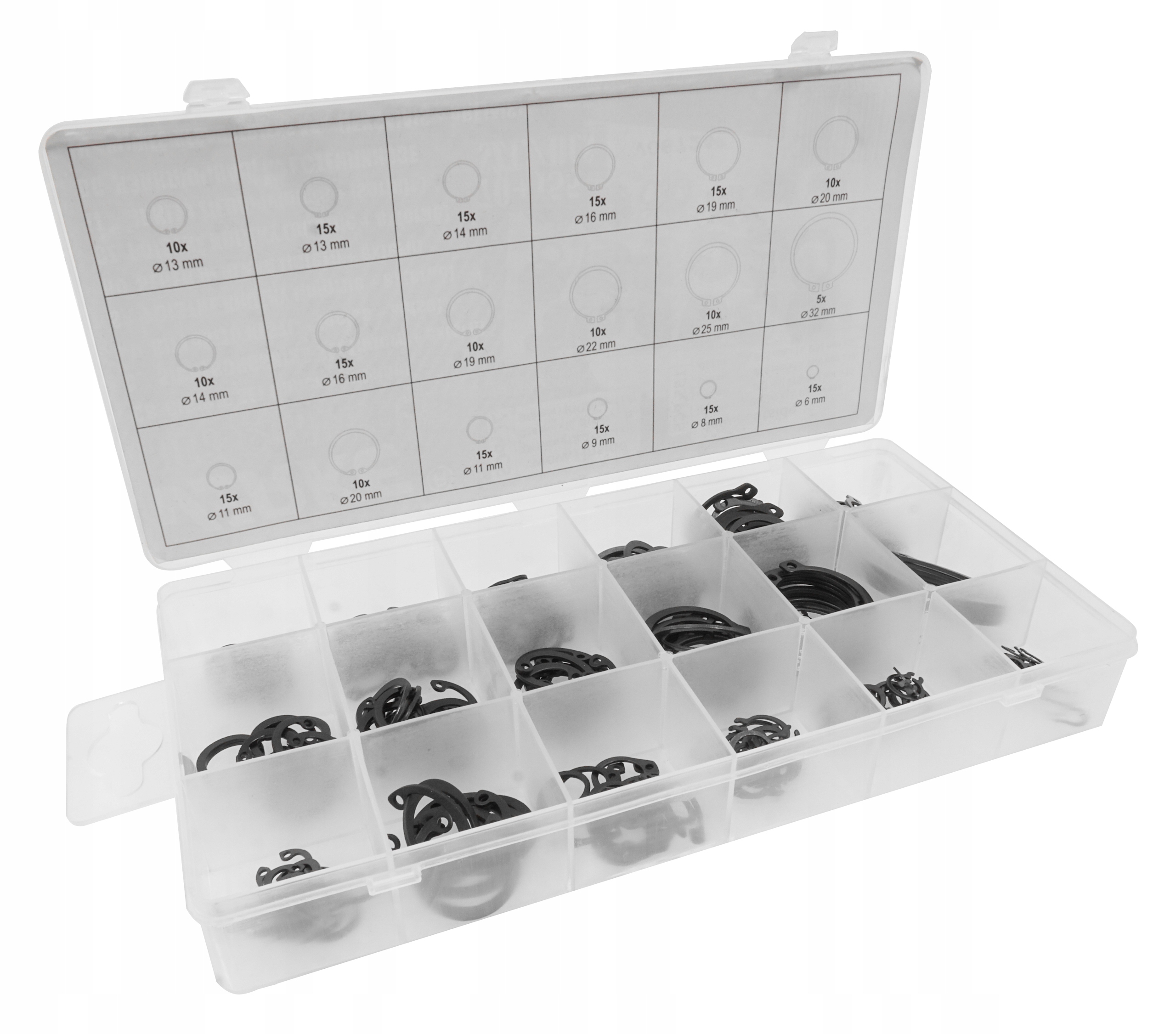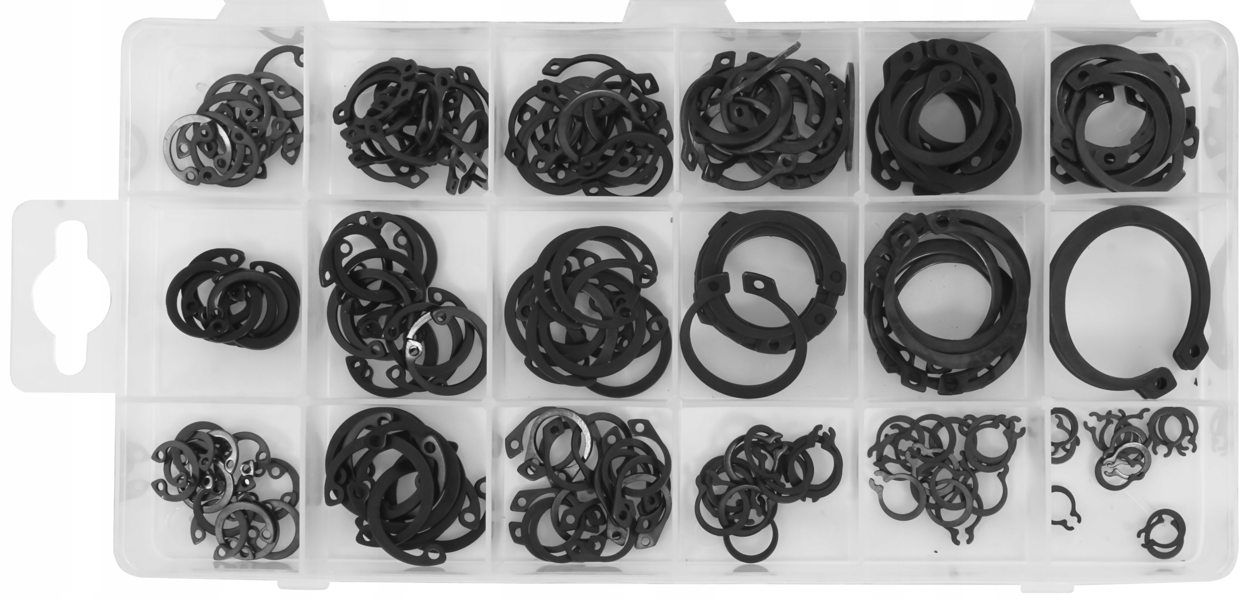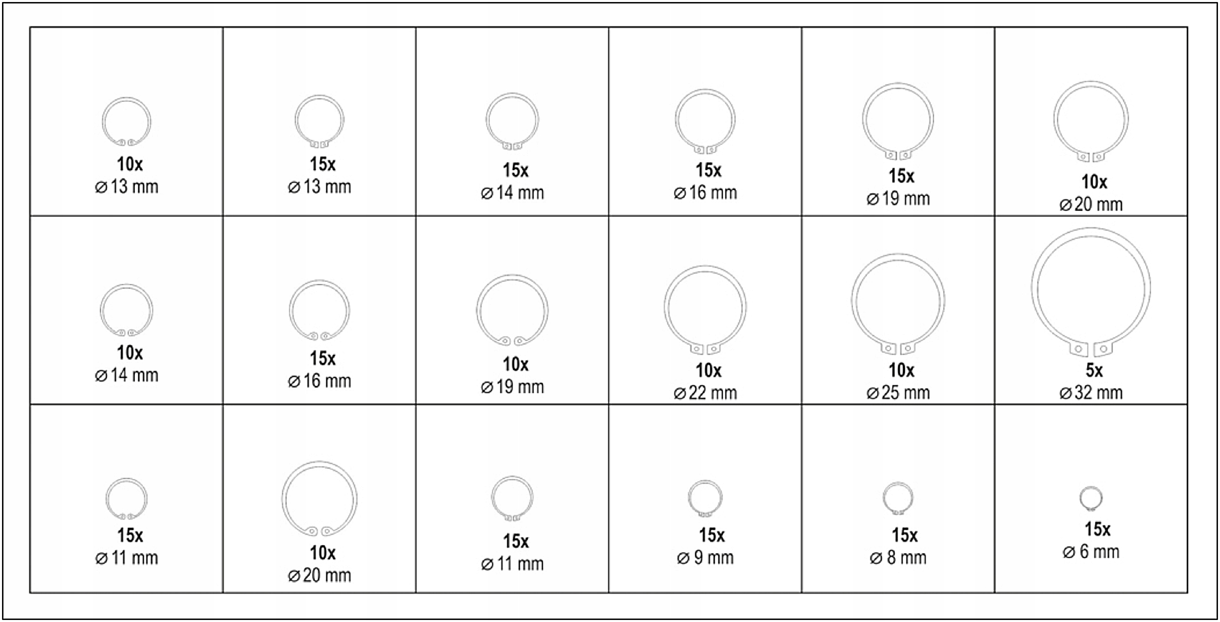 - наружные кольца Зегера х155 (Ø6 мм х15, Ø8 мм) х15, 09 мм х15, 011 мм х15, 013 мм х15, 014 мм х15, 16 мм х15, 19 мм х15, 20 мм х10, 22 мм х10, 25 мм х10, 32 мм х5)
