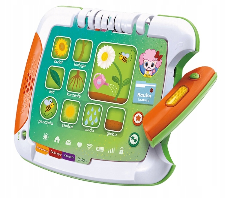 Корпус планшета выполнен из качественного пластика белого и оранжевого цвета с зелеными элементами сзади. Центральная часть заполнена страницами из специальной бумаги, что обеспечивает долгое и комфортное использование – дети могут быстро и эффективно перелистывать отдельные страницы, открывать их содержимое и решать все новые и новые интересные задачи. Планшет также можно использовать как игрушку 2-в-1: просто переверните его, и он превратится в книгу рассказов.