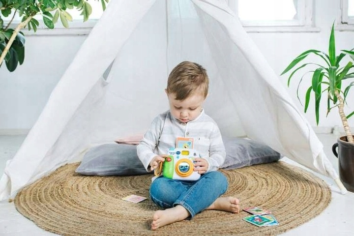 В камере имеется более 170 выражений, песен и мелодий, пять двусторонних фотографий, благодаря которым ребенок изучает числа, формы и цвета, а также подвижная оранжевая линза, позволяющая открывать противоположности, такие как день и ночь или солнце и луна.