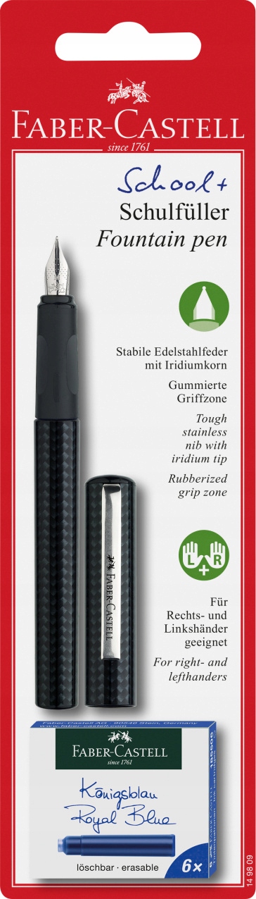 Вечная ручка от Skool+ Faber-Castell Series 1 PCS. В черном (углерод) + картриджи 6 ПК в пакете блистера. Созданные для школьного использования, они поддерживают правильное расположение пальцев. С мягкой, эргономичной и незвучной зоной ручки, чтобы обеспечить комфорт использования. Скипка с гибким металлическим зажимом. Ручка оснащена высококачественной прочной сталью из нержавеющей стали с наконечником иридия, устойчивой к большему давлению. Подходит как для правого, так и для левшей. Для стандартных струйных картриджей.