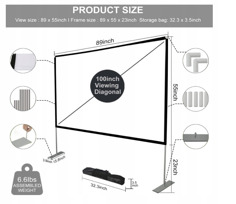 - Простая сборка: вы можете легко завершить установку в течение 5 минут без инструментов, следуя инструкциям на экране проектора. Если вы столкнулись с ветреной погодой, вам нужно использовать предоставленные нами веревки, гвозди и мешки с водой, чтобы закрепить ее. Вы можете прекрасно наслаждаться фильмом на свежем воздухе.