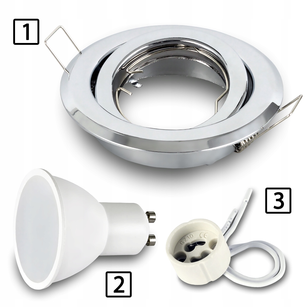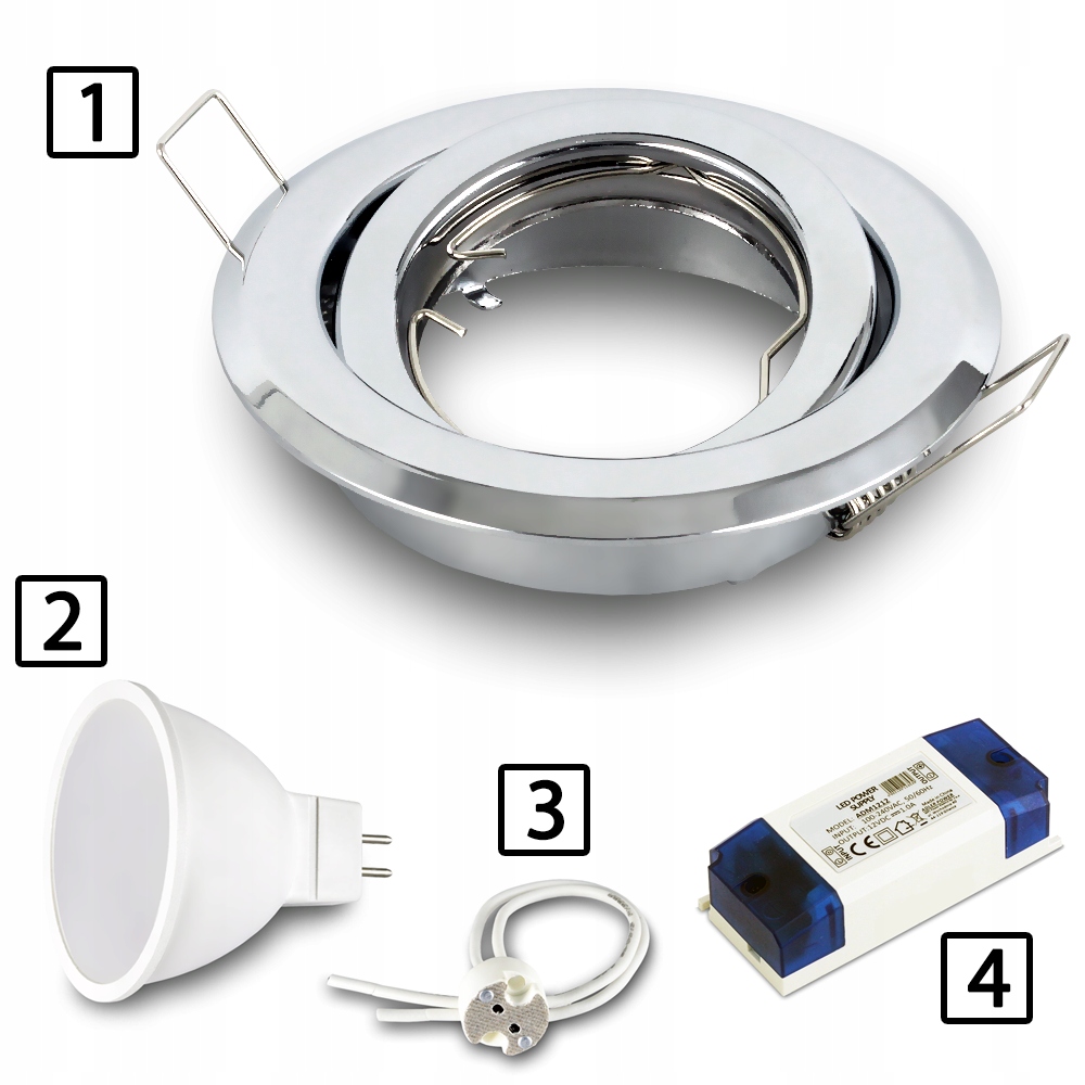 Чтобы получить полный комплект освещения, необходимо приобрести лампочку GU10 и патрон для лампы (версия 230В) или лампочка Gu5.3, патрон для лампы и блок питания светодиодов (версия 12В). Ниже мы представляем, как должен выглядеть такой набор.