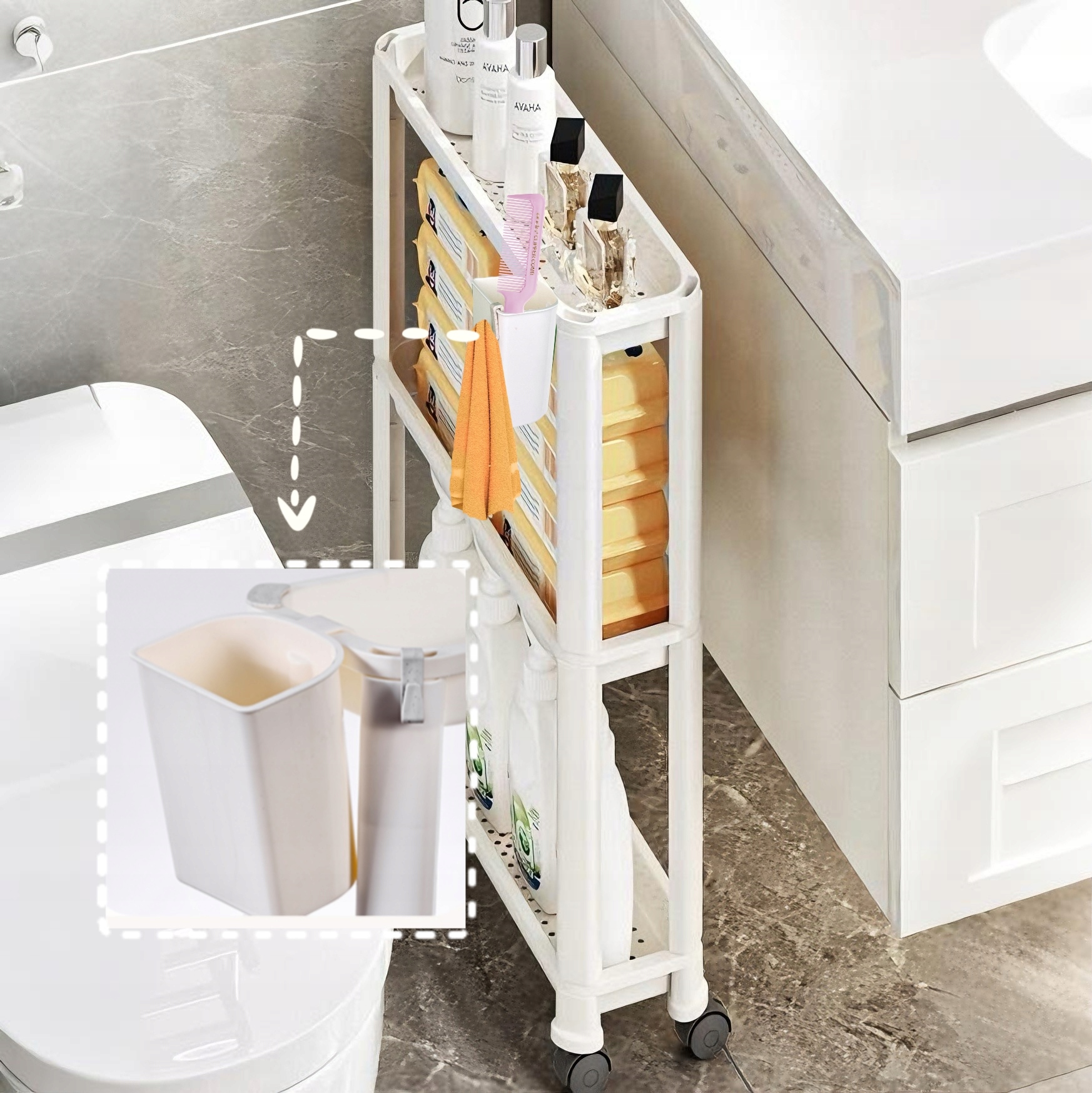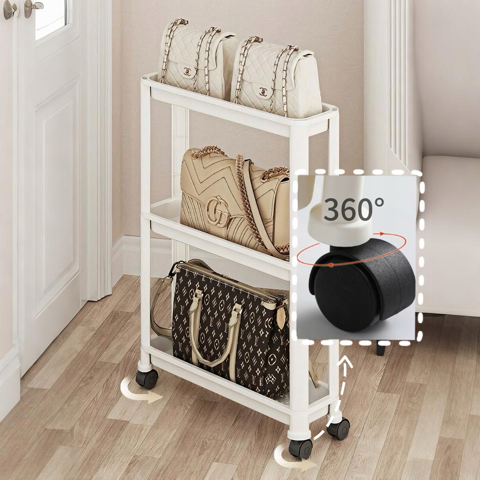 Полка Hooha оснащена четырьмя поворотными на 360 градусов колесами, которые позволяют легко перемещать ее из одного места в другое. Свободно перемещайтесь по ванной или другой комнате, чтобы получить доступ к тому, что вам нужно, где бы вы ни находились.