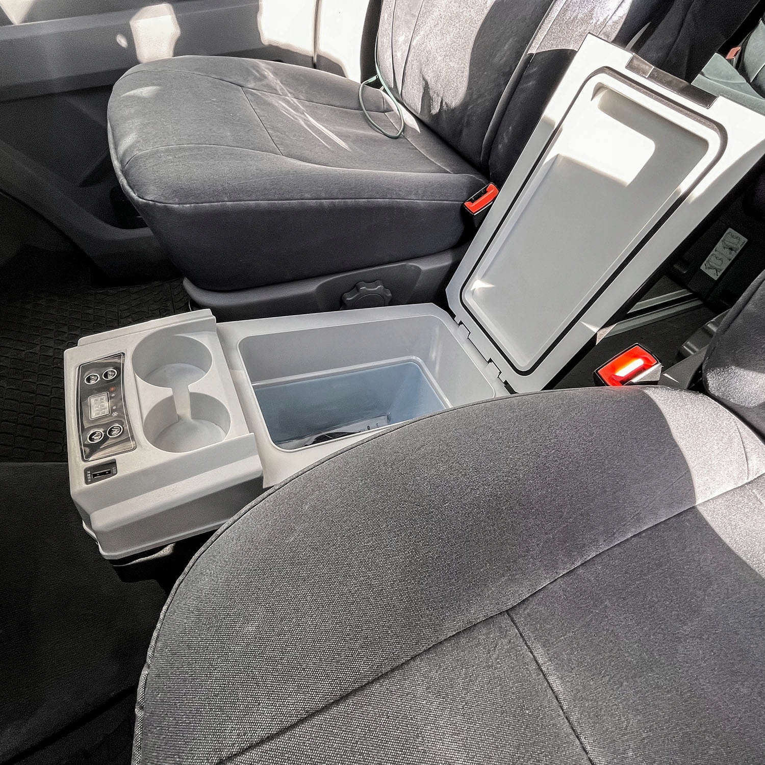 Чрезвычайно компактный и практичный. Наш портативный холодильник был разработан с учетом оптимального использования пространства. Благодаря своим размерам он идеально помещается между сиденьями первого ряда сидений кемпера, обеспечивая легкий доступ к охлажденным продуктам во время поездки.