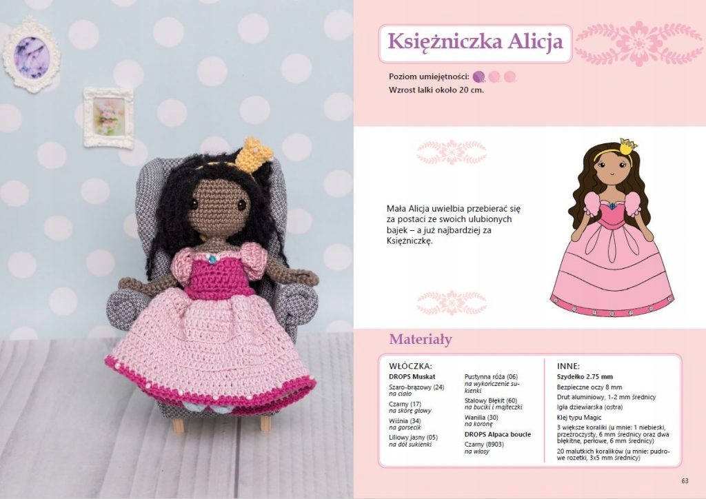 Обширная теоретическая часть и описание материалов. В книге собрана вся теория вязания куклы крючком - описание выполнения каждого стежка, дополнительные приемы, такие как невидимое снятие петель, невидимая смена цвета.