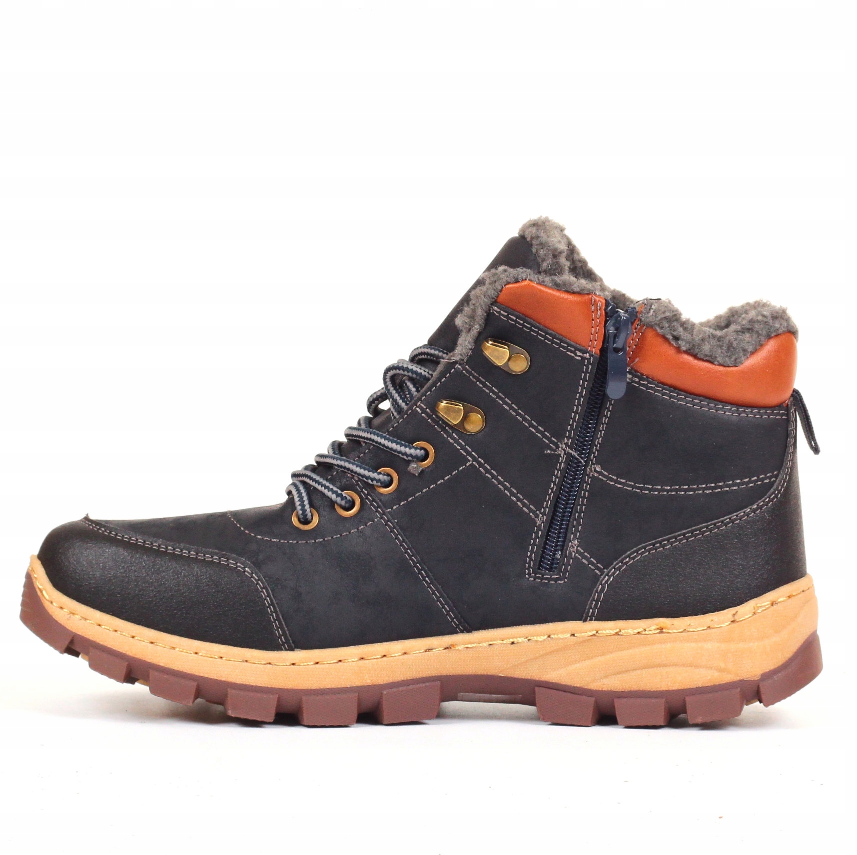 Мужская утепленная зимняя обувь, темно-синего цвета, изготовлена из высококачественных материалов. Шнуровка регулирует ширину обуви. Высокий верх обеспечивает устойчивость. Подошва проклеенная, что обеспечивает долгий срок службы. Он полностью утеплен мягким мехом, идеально подходящим для холодных дней. Противоскользящая подошва с протектором улучшает амортизацию стопы.