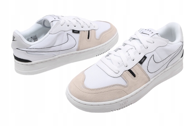 Кроссовки Nike Squash Type GS выполнены в сдержанных цветах и имеют конструкцию, сочетающую воздушную белую сетку с кремовой замшевой накладкой.