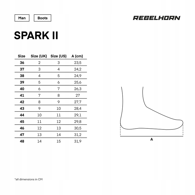 Rebelhorn Spark II — короткие городские мотоциклетные ботинки спортивного характера. Имеют систему быстрой регулировки и шнуровки ATOP. Защита в обуви Spark II обеспечивается сертифицированными протекторами лодыжки и усилениями на носке обуви и под рычагом переключения передач. Они оснащены дышащей подкладкой из 3D-сетки и панелями из стальной сетки.