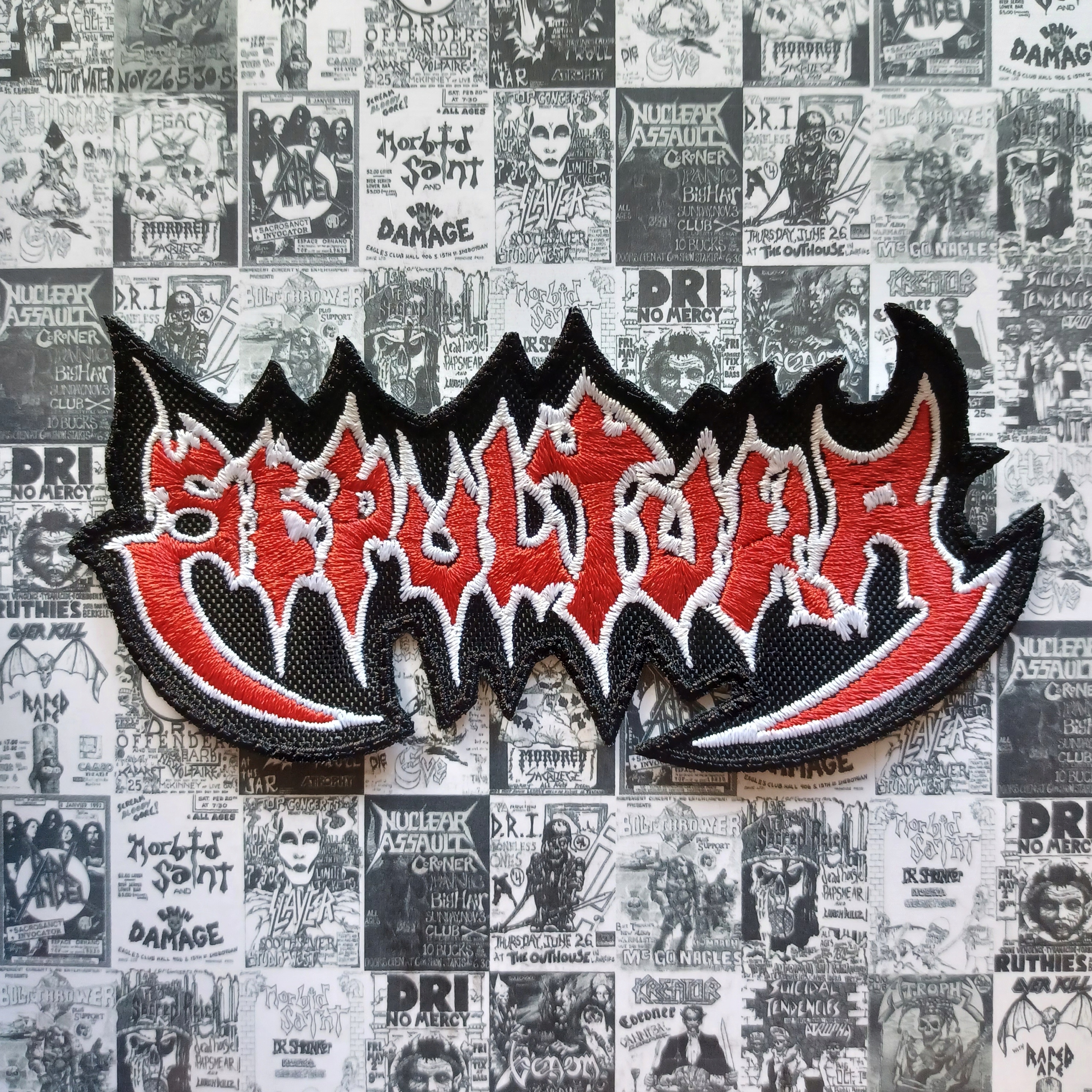 \W/ - НАШИВКА С ВЫШИВКОЙ - SEPULTURA - СТАРЫЙ ЛОГОТИП - БЕЛЫЙ И КРАСНЫЙ - 6,5 x 12 СМ