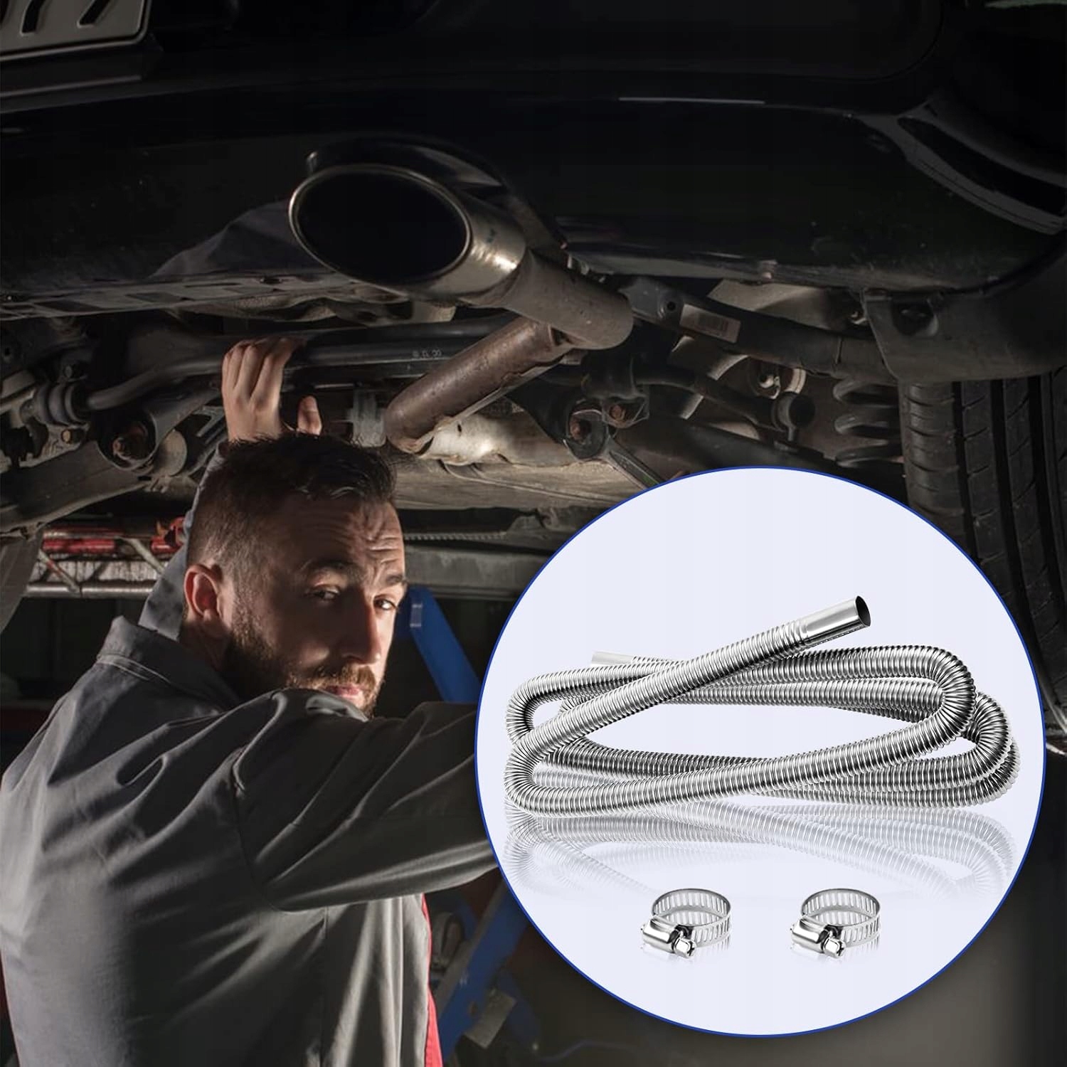 🚗🚗 Простая установка: Выпускной шланг генератора растягивается и гибок. Глушитель можно свободно выдвигать во время работы и остановки, не создавая при этом нагрузки на выхлопную трубу. Просто снимите старую или поврежденную оригинальную выхлопную трубу, подсоедините новую выхлопную трубу из нержавеющей стали и глушитель к вашему автомобилю и закрепите концы выхлопной трубы зажимами и винтами.