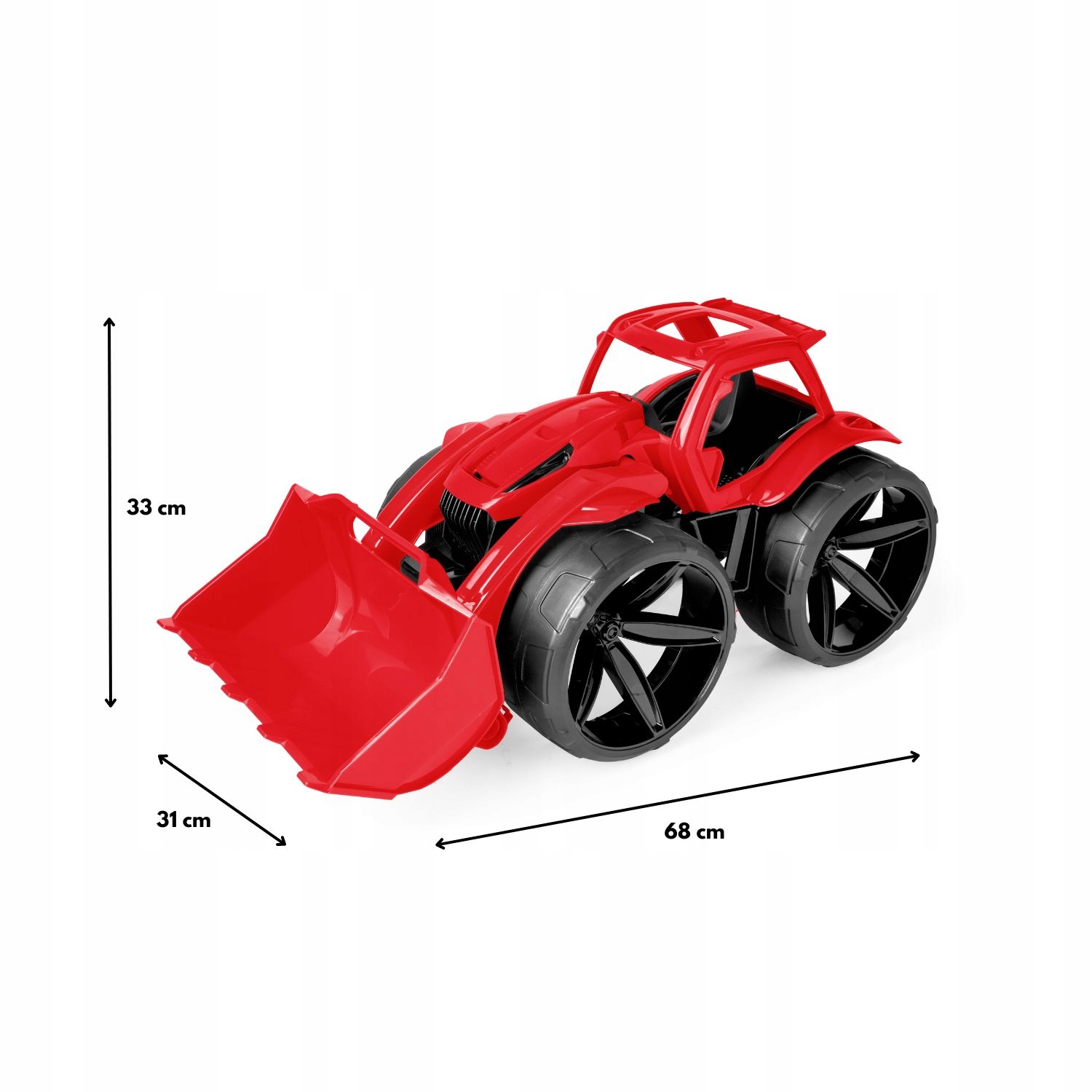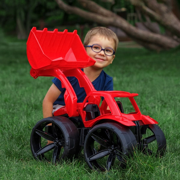 Бульдозер MAXIMUS в сочно-красном цвете отличают: современный дизайн, прочная, легкая конструкция, современная линия кузова с большими матовыми колесами и красивой отделкой деталей. Кроме того, он имеет подвижные элементы, такие как большие матовые колеса, бульдозерную стрелу и ковш, которые позволяют разнообразно и реалистично развлечься как дома, на песке, так и в саду. Сырье, из которого изготовлены автомобили Maximus, устойчиво к погодным условиям. Длина автомобиля 68 см.